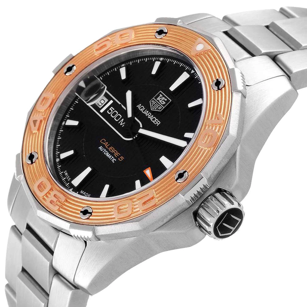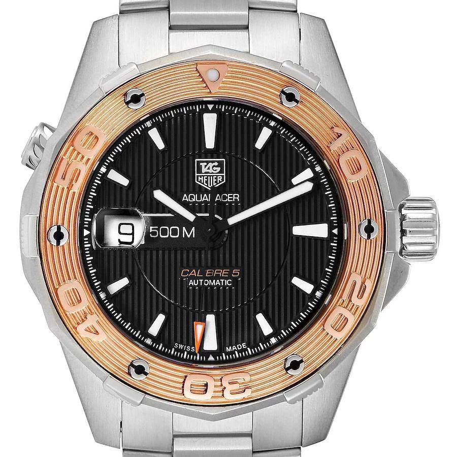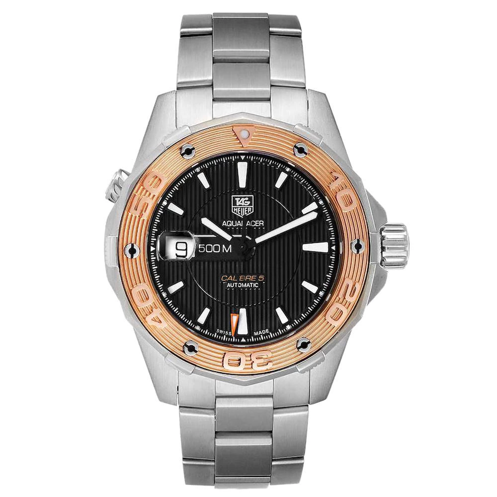 Tag Heuer brings this ethereal wristwatch that has a round stainless-steel case and a matching faceted bezel with an 18k rose gold inlay. It encases a black linear guilloche dial that features luminous baton indices as hour-markers, a date window, and luminous hands. The watch is secured by a steel bracelet.