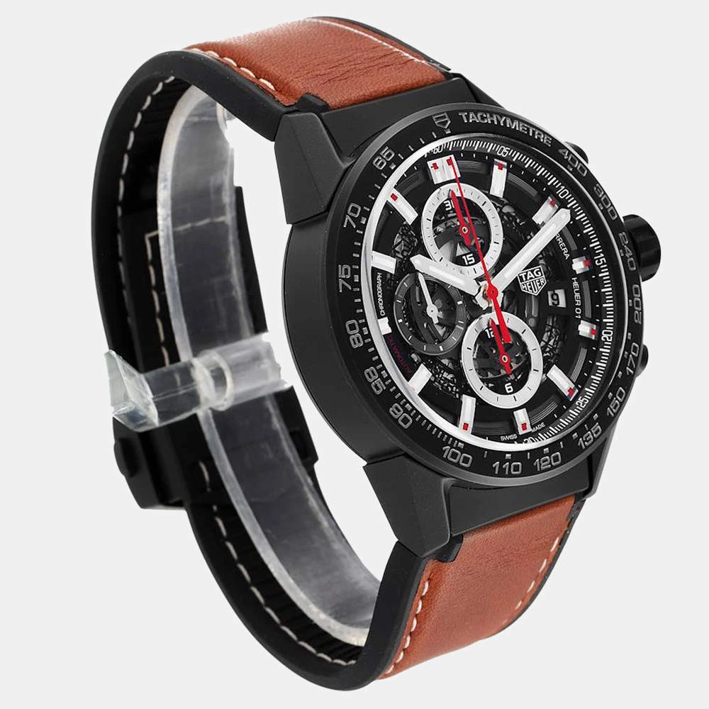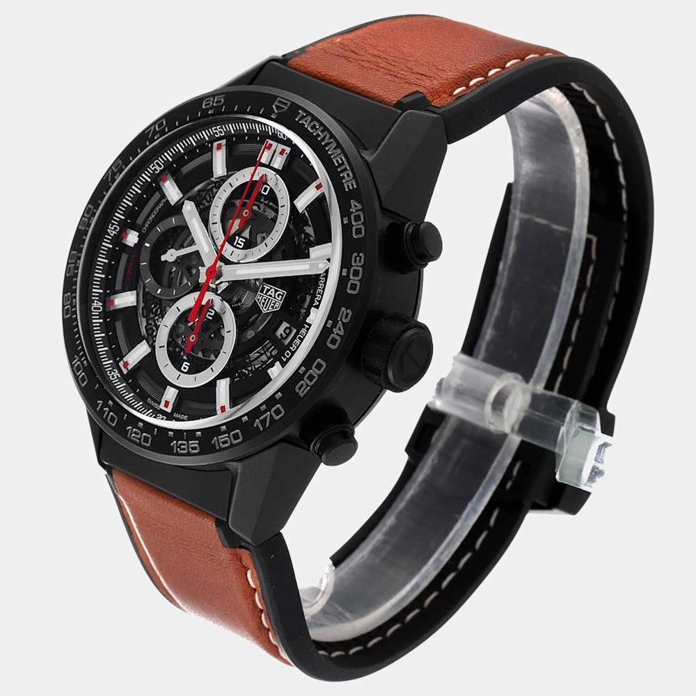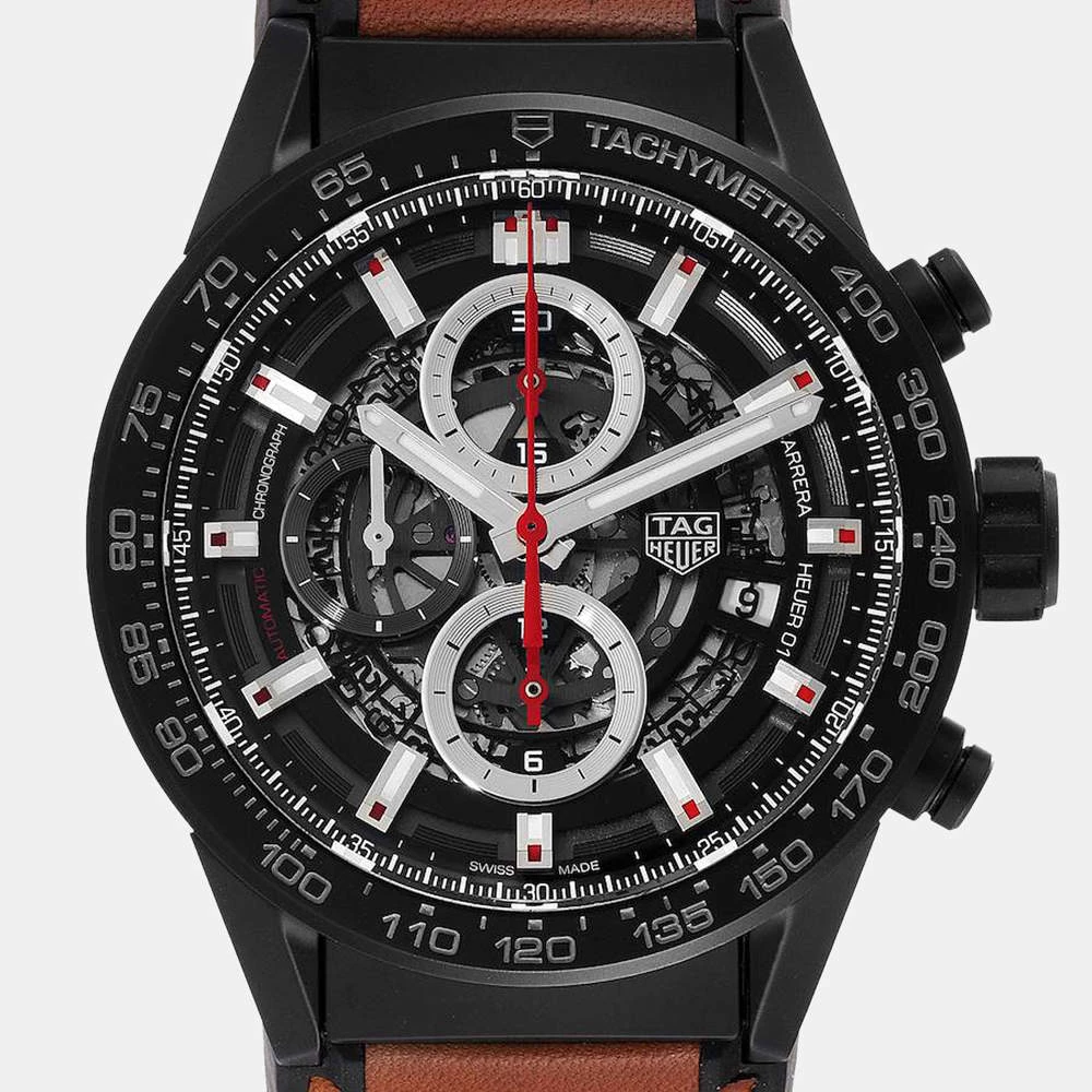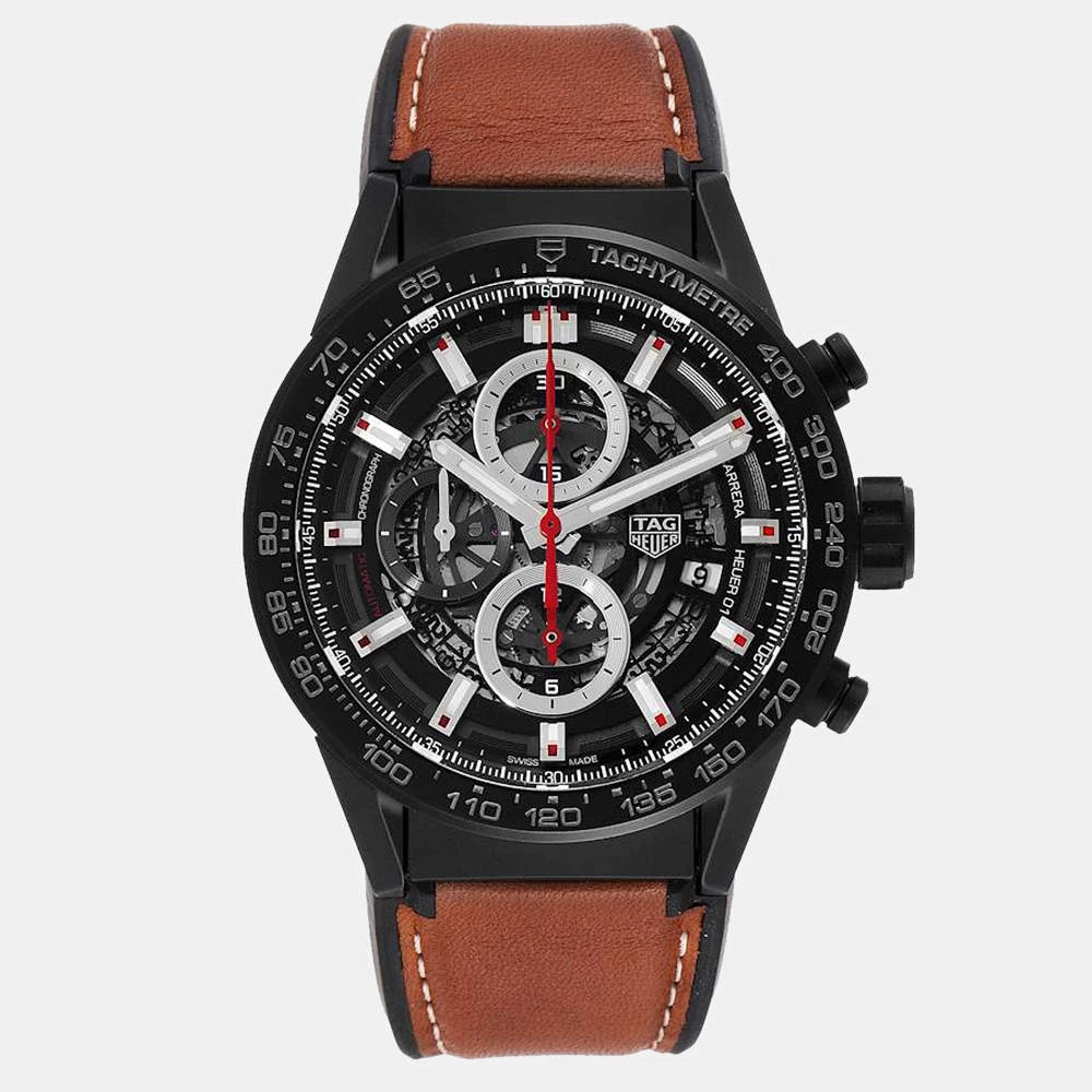 For a dashing and stylish everyday look, go for this striking Tag Heuer Carrera wristwatch. The watch pairs a black skeleton dial featuring luminescent hands and Arabic numerals with a black matte ceramic case and a black ceramic bezel with a grey tachymeter scale. It is secured by a brown leather strap with a black ceramic deployant clasp.