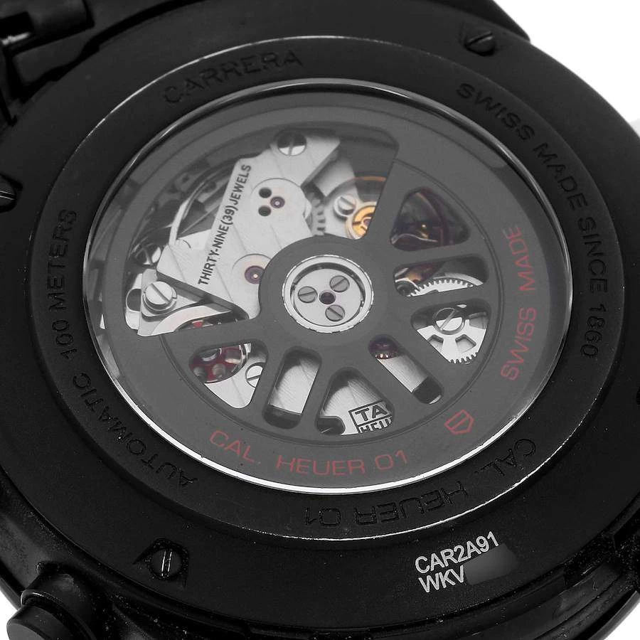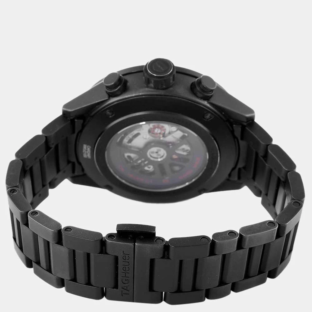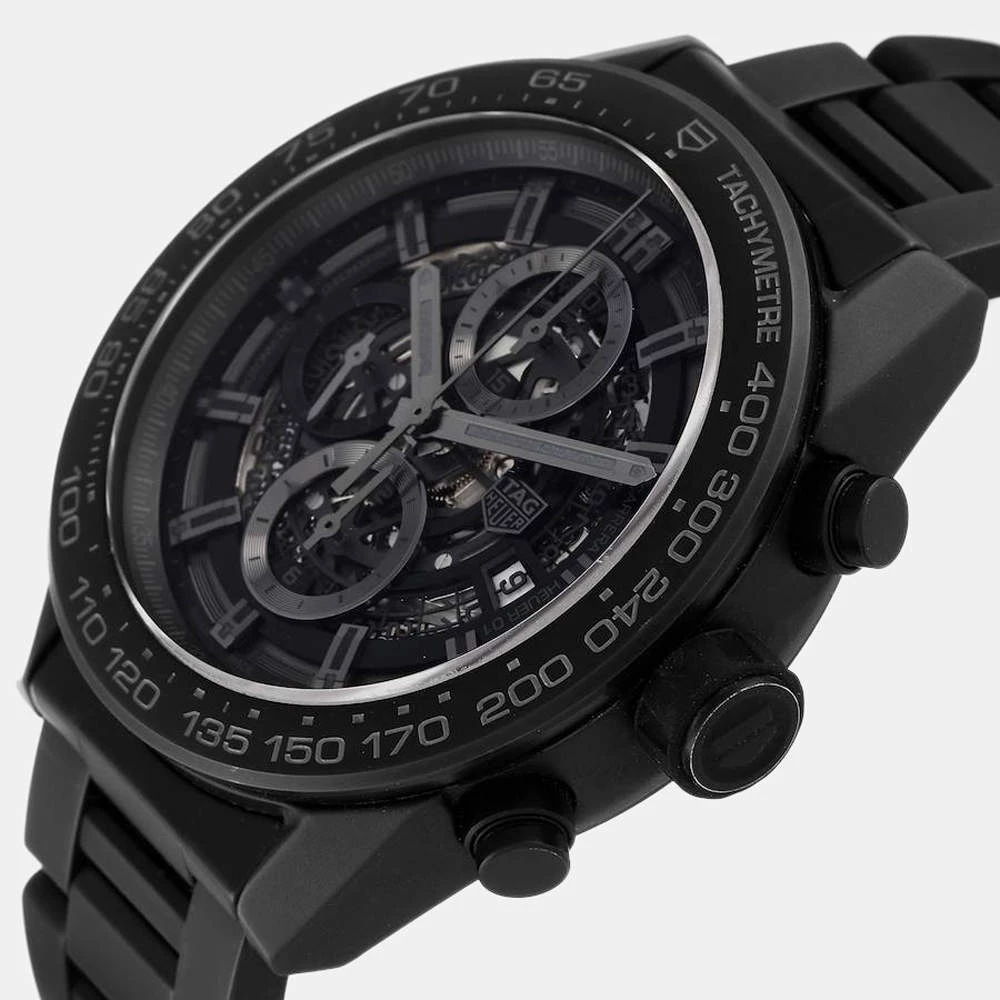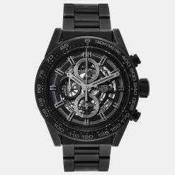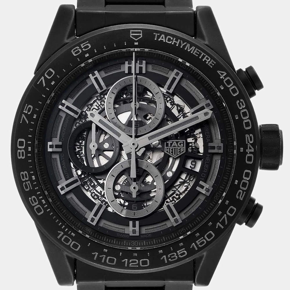 Tag Heuer brings this arresting wrist watch that has a round black ceramic case and a matching bezel with a tachymeter. It encases a skeleton dial which features luminous baton indices as hour-markers, a date window, three sub dials, and luminous hands. The watch is secured by a black ceramic bracelet.