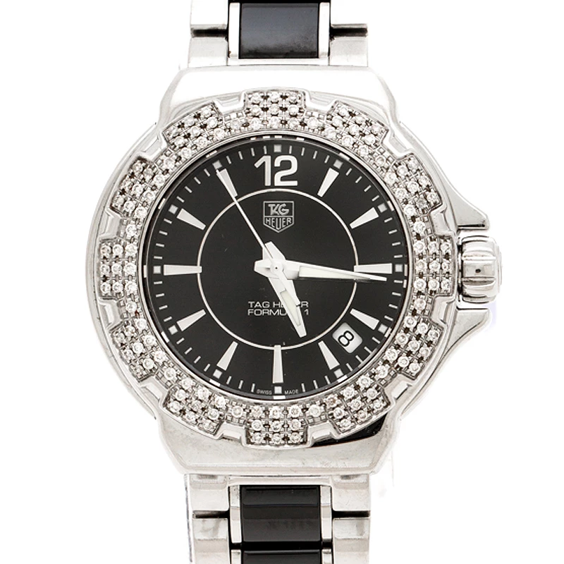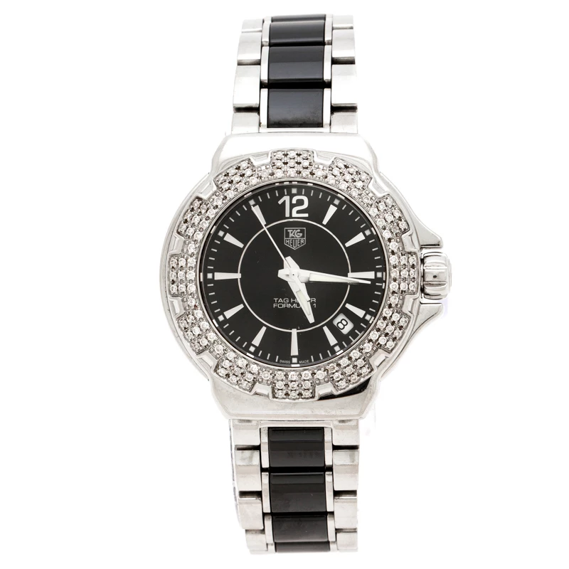 Formula 1 watches from Tag Heuer are high-performance timepieces that are meticulously crafted to meet the wants of an on-the-go life. Designed with a 37 mm stainless steel case, the watch features an exquisite diamond-studded bezel and a black circular dial with three hands and index hour markers. The dial is further equipped with a date window between four and five o’clock position. Powered by a quartz movement and graced with water-resistance of a whopping 200 meters, this robust, sporty-looking watch is complete with a stainless steel bracelet, accented with black ceramic and secured by a push-lock closure.