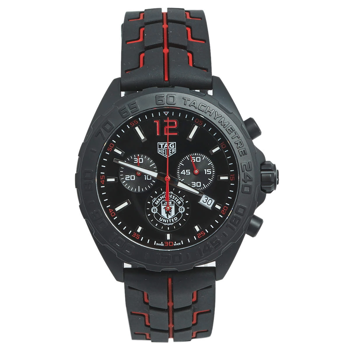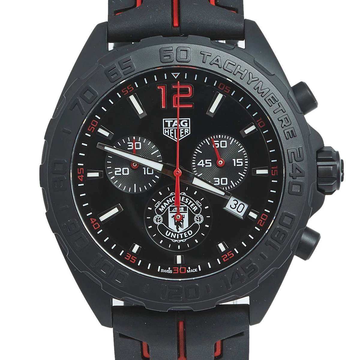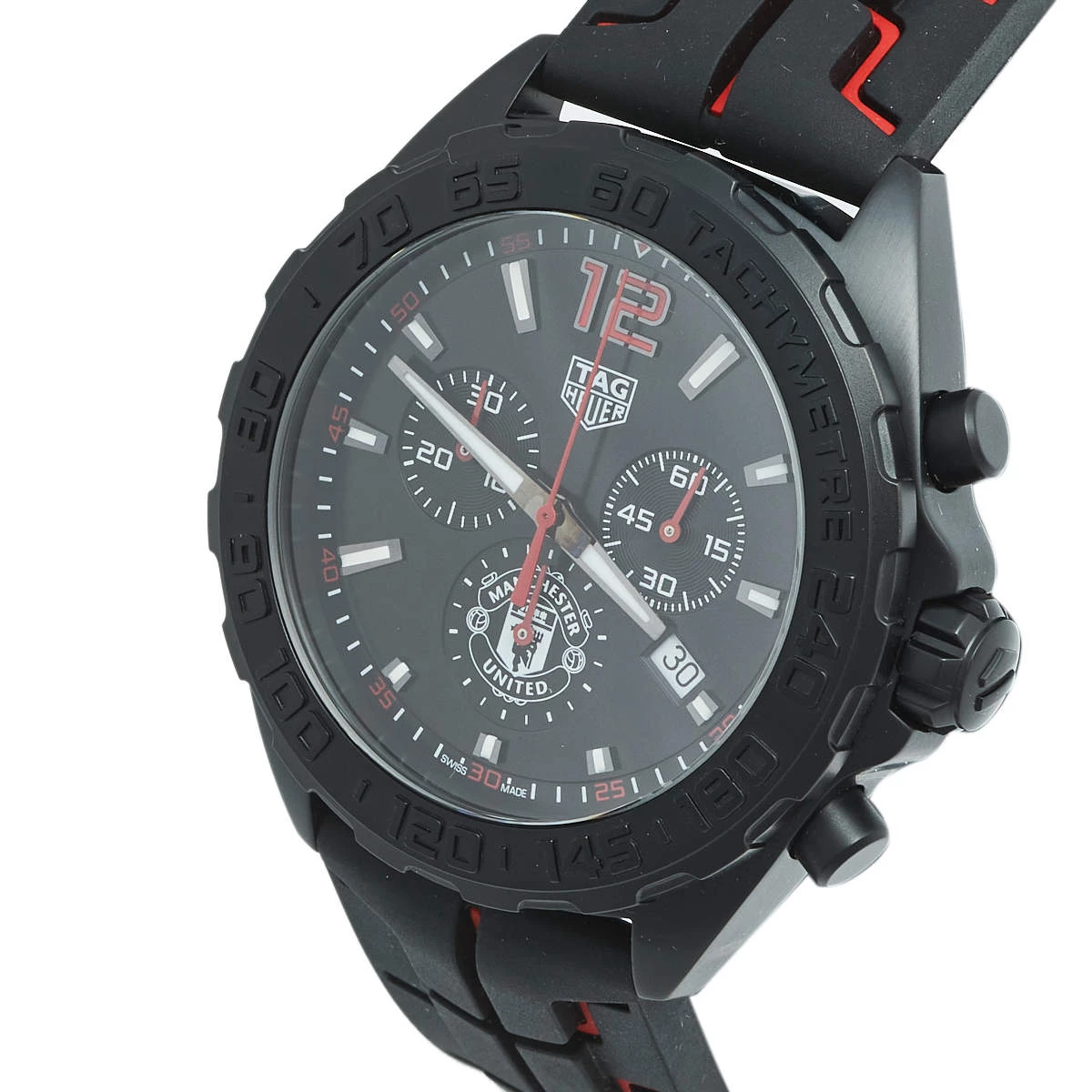 Formula 1 watches from Tag Heuer are high-performance timepieces that are meticulously crafted to meet the wants of an on-the-go life. Designed with a 43 mm PVD-coated stainless steel case, this watch from the Manchester United edition features a circular dial with luminous hands and index hour markers. The dial is further equipped with minute markers, two subdials, and a date window. A tachymeter scale is present on the bezel. Powered by a quartz movement and graced with a water resistance of 200 meters, this robust, sporty-looking watch is complete with a rubber strap secured by a buckle clasp and covered back.