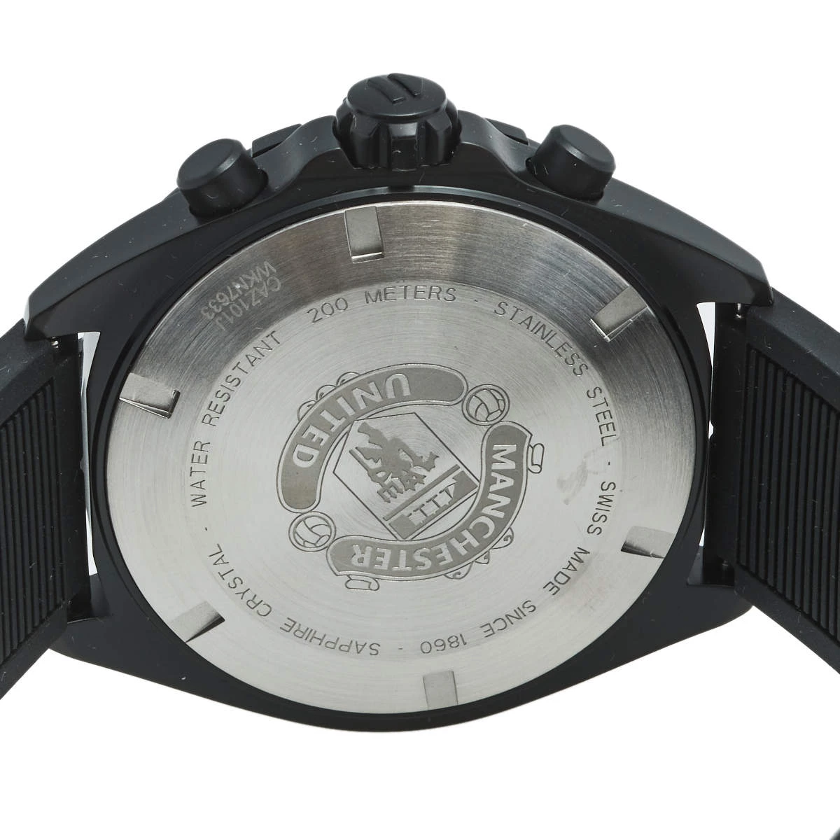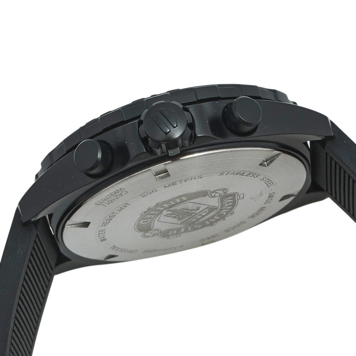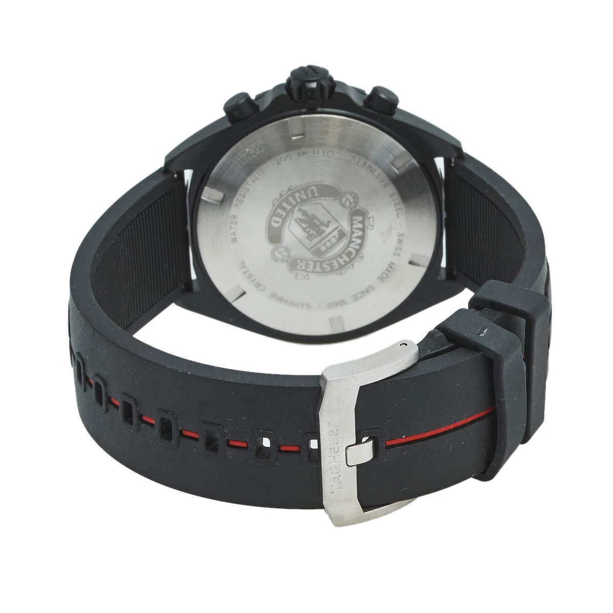 Formula 1 watches from Tag Heuer are high-performance timepieces that are meticulously crafted to meet the wants of an on-the-go life. Designed with a 43 mm PVD-coated stainless steel case, this watch from the Manchester United edition features a circular dial with luminous hands and index hour markers. The dial is further equipped with minute markers, two subdials, and a date window. A tachymeter scale is present on the bezel. Powered by a quartz movement and graced with a water resistance of 200 meters, this robust, sporty-looking watch is complete with a rubber strap secured by a buckle clasp and covered back.
