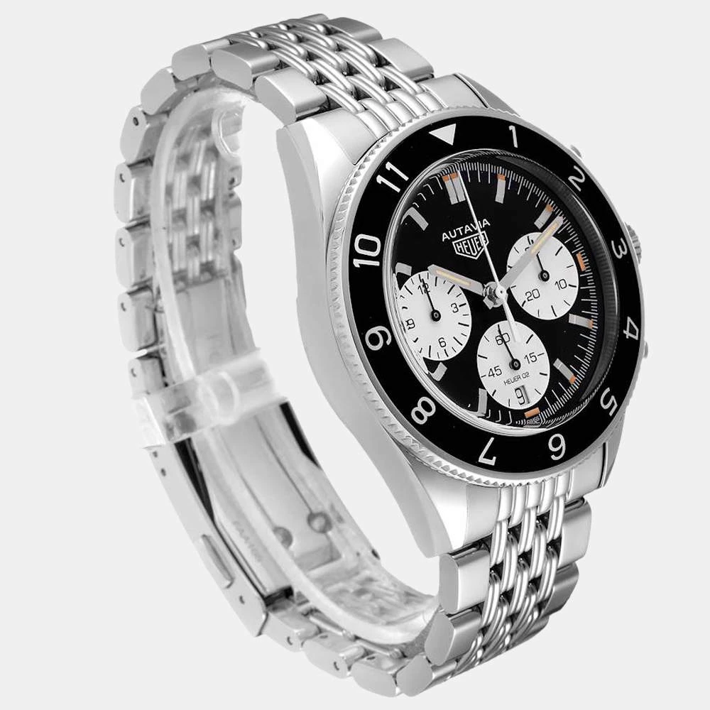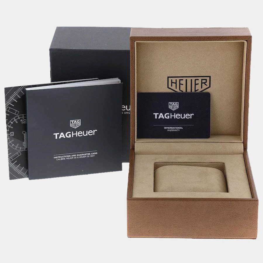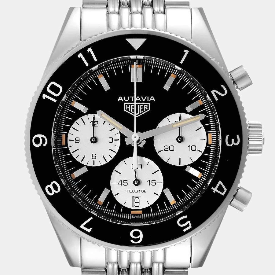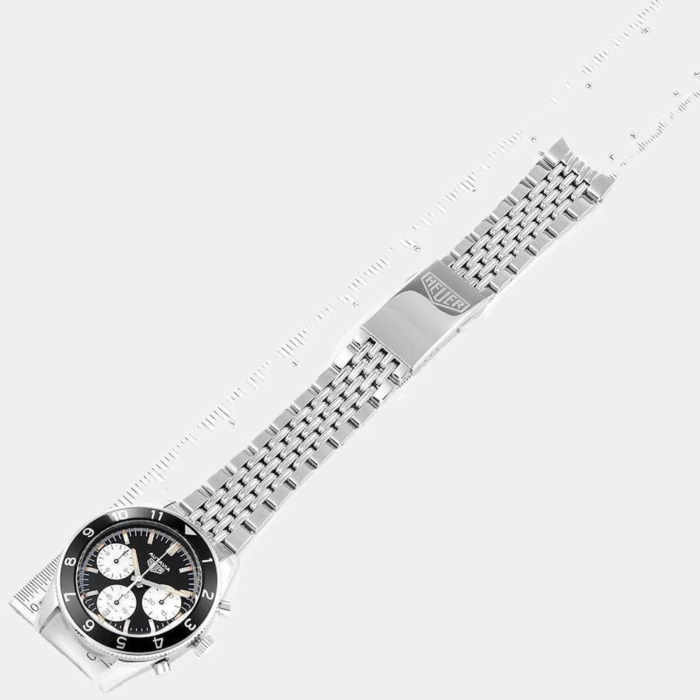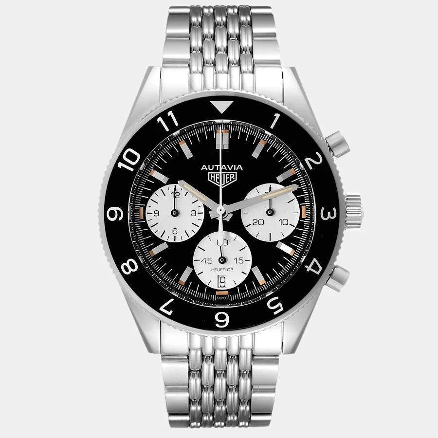 Tag Heuer brings this classic wrist watch that has a round stainless-steel case and a matching notched bezel with a black inlay. It encases a black dial which features raised steel baton indices as hour-markers, a date window, three silver sub dials, and steel luminous hands. The watch is secured by a steel bracelet.