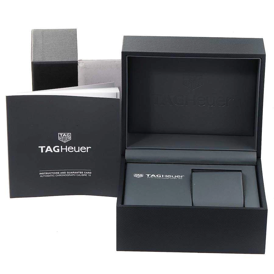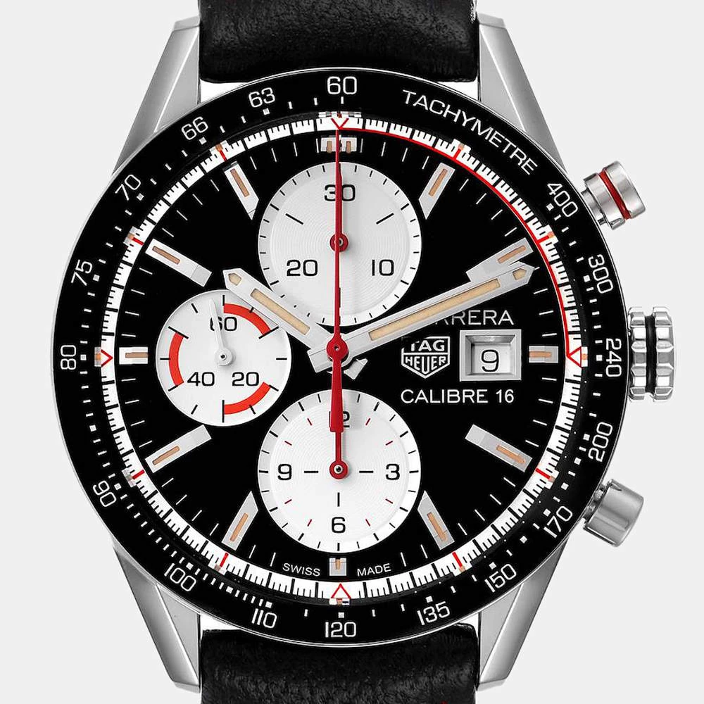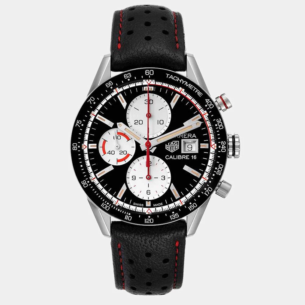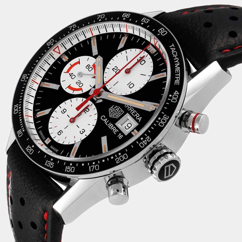 Tag Heuer brings this charming wrist watch that has a round stainless-steel case and a black bezel with a tachymeter. It encases a black dial which features steel luminous baton indices, a date window, three white sub dials, and steel luminous hands. The watch is secured by a black and red leather strap.