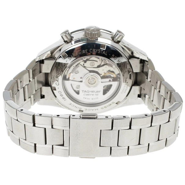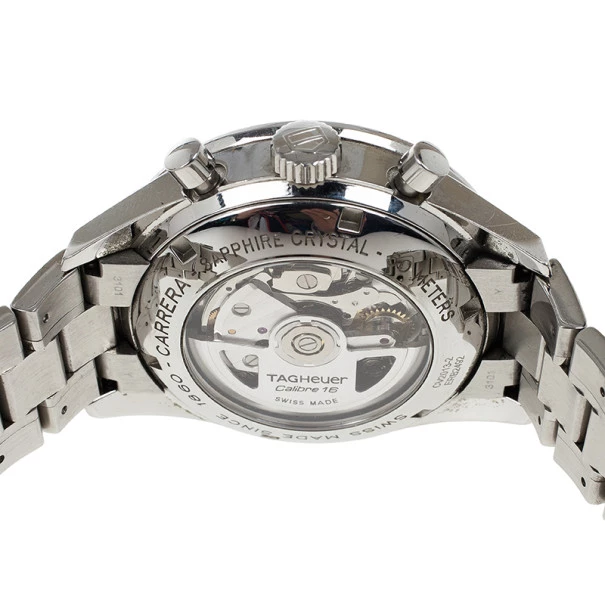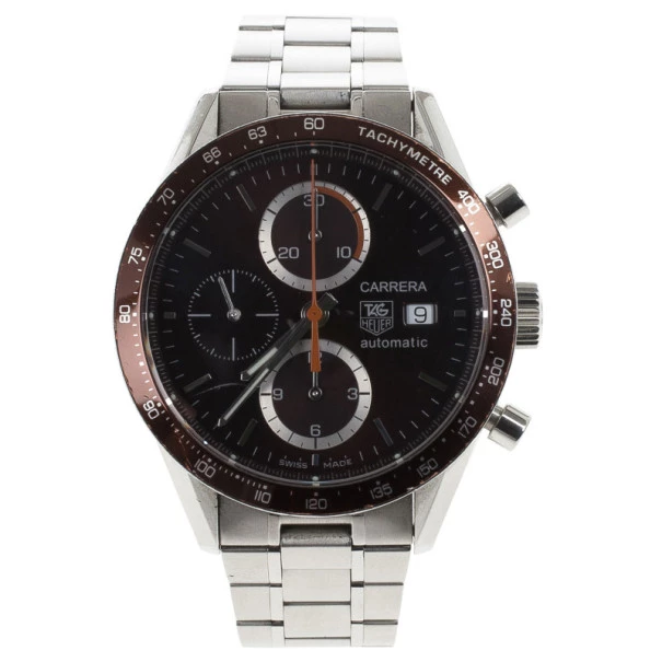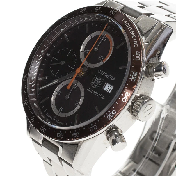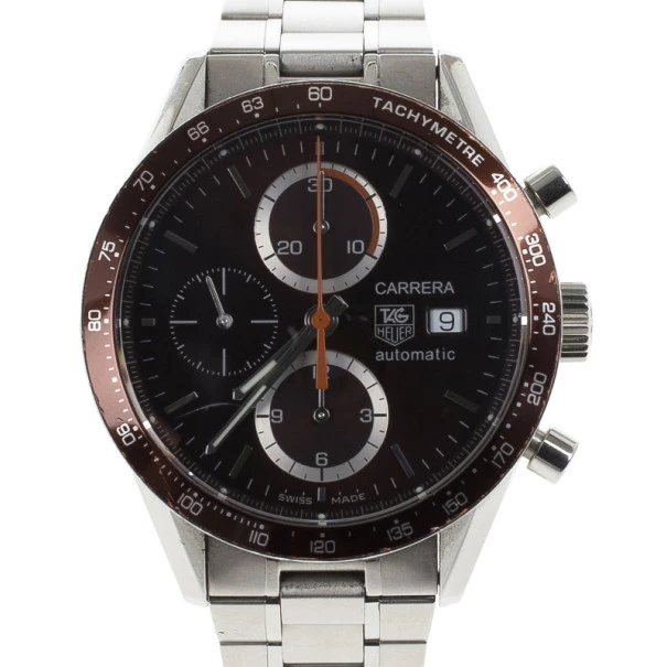 Combining black, silver, and metallic brown, this Tag Heuer watch is a sophisticated piece that will keep you at the top of your game. Its stainless steel case is coupled with a dark brown Tachymetre bezel with black Arabic numerals and indicators. A deep black color, the dial is designed with silver-tone hour and minute indicators with luminous hands and a red minute indicator. This 50M water resistant watch includes three chronographs and a date window, matched with a stainless steel bracelet with a monogrammed clasp closure.Original Retail Price: US $2,775