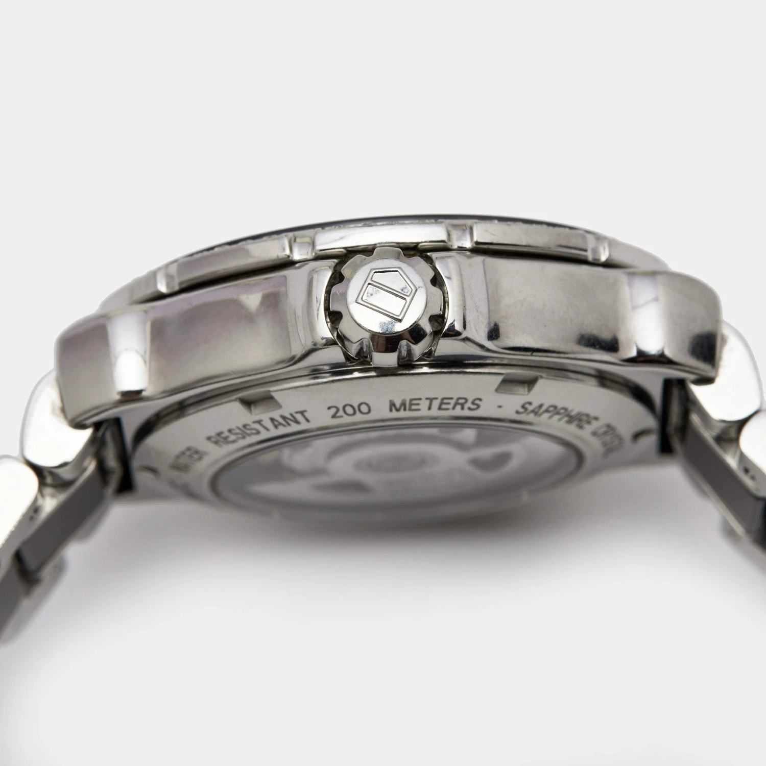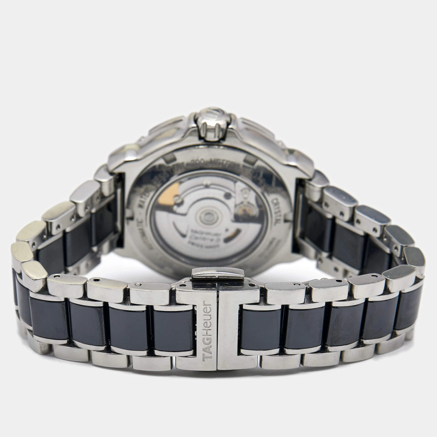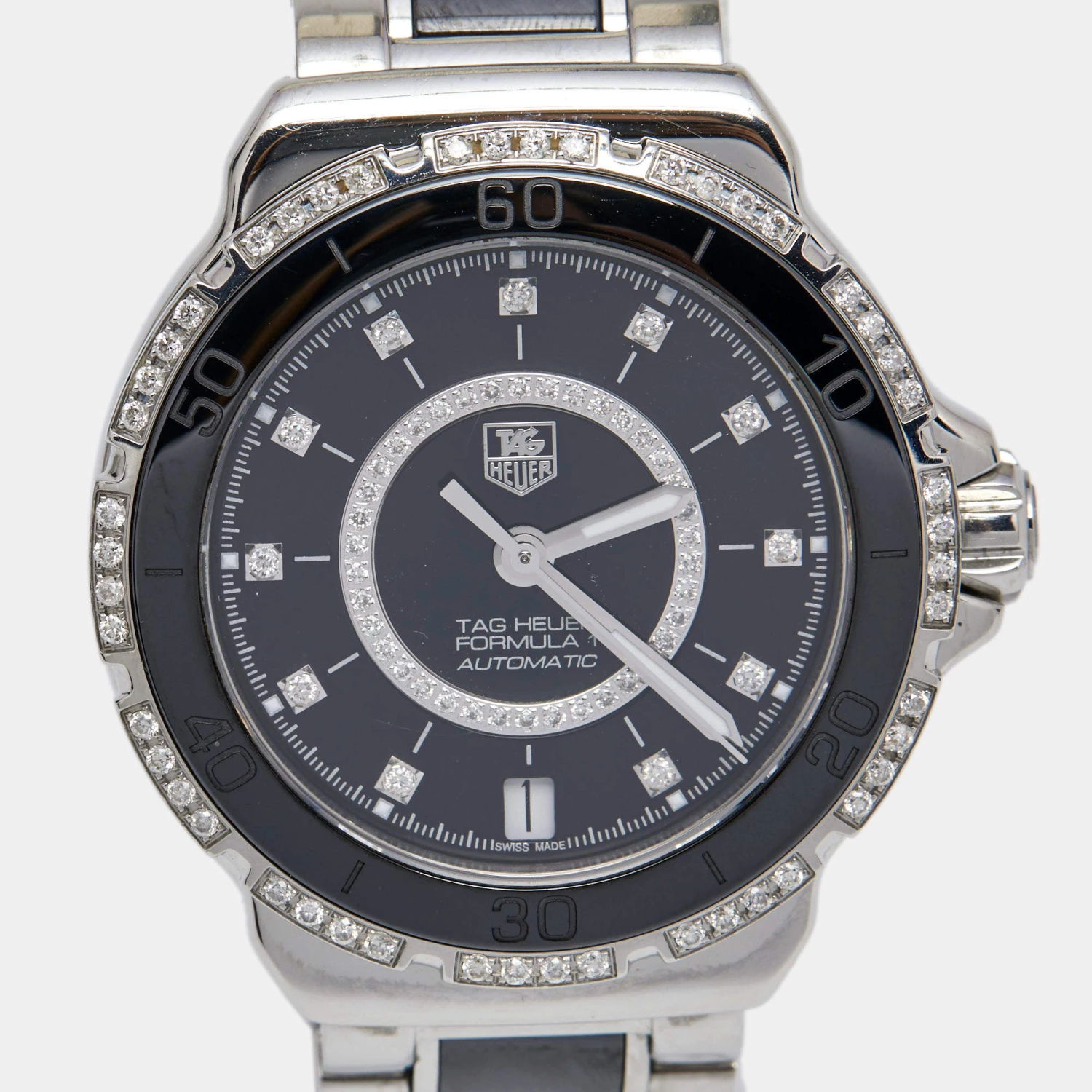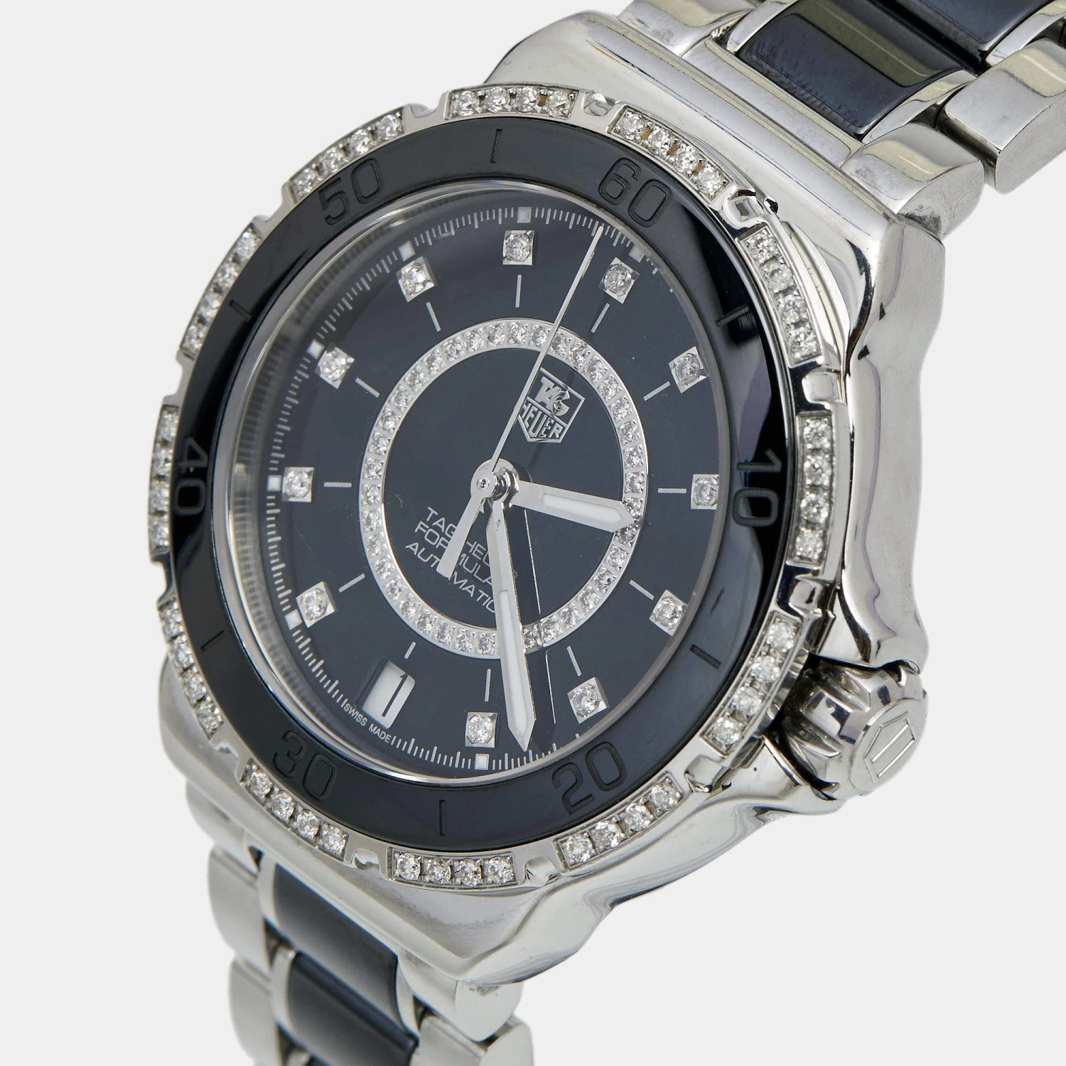 Formula 1 watches from TAG Heuer are high-performance timepieces that are meticulously crafted to meet the wants of an on-the-go life. Inside the 37 mm case, this Formula 1 WAU2212 has a black dial with three hands, diamond hour markers, an inner diamond ring, and a date window. The quartz watch in stainless steel and ceramic has more diamonds on the bezel and is complete with 200 meters of water resistance.