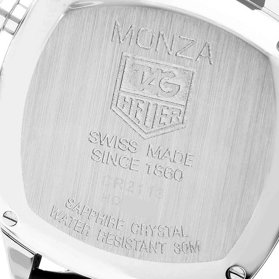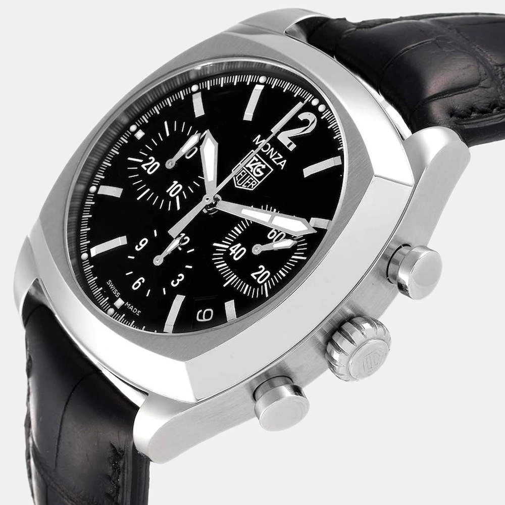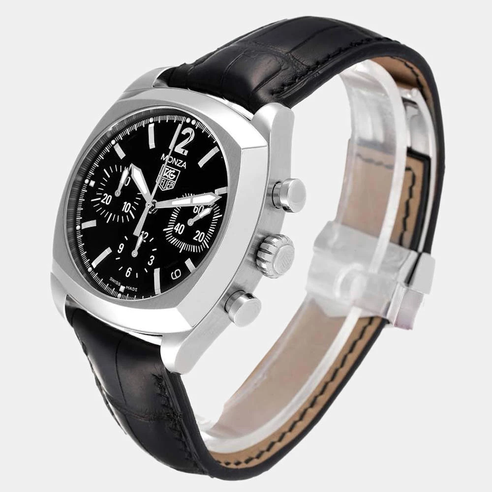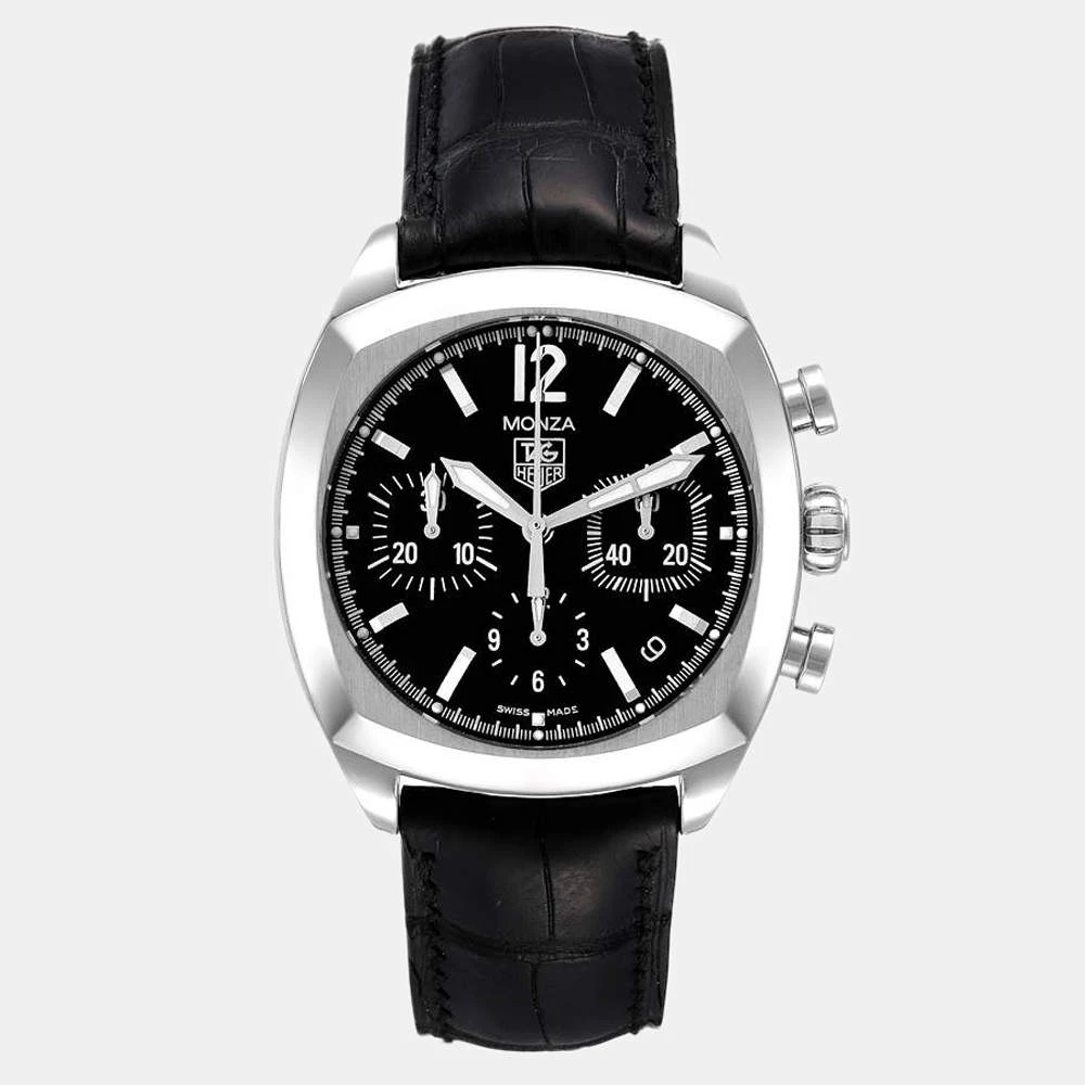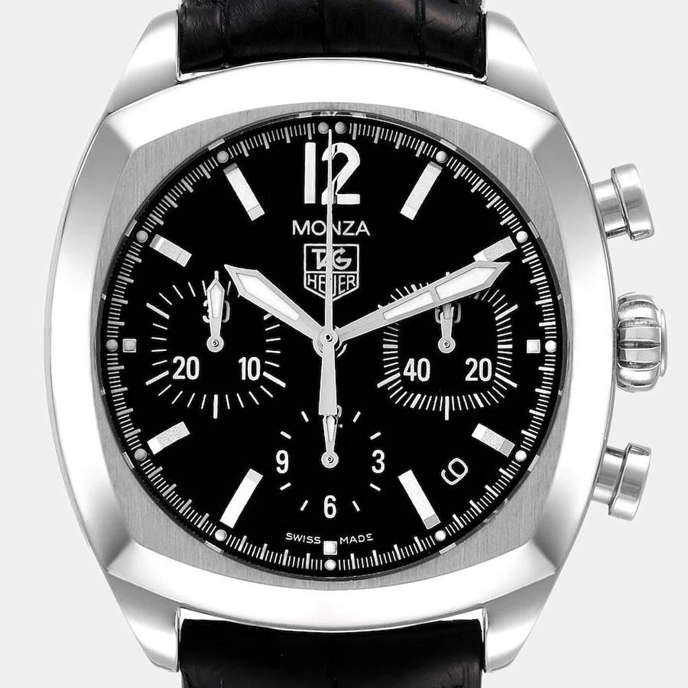 The house of Tag Heuer presents this wrist watch that has a cushion stainless-steel case and a matching smooth bezel. It encases a black dial which features steel baton indices as hour-markers, a date window, three sub dials, and steel luminous hands. The watch is secured by a black leather strap.