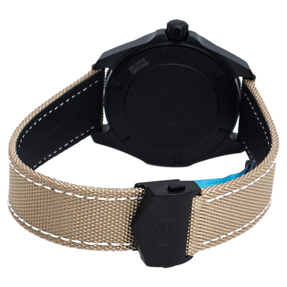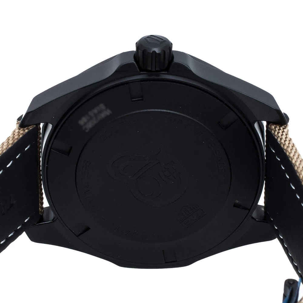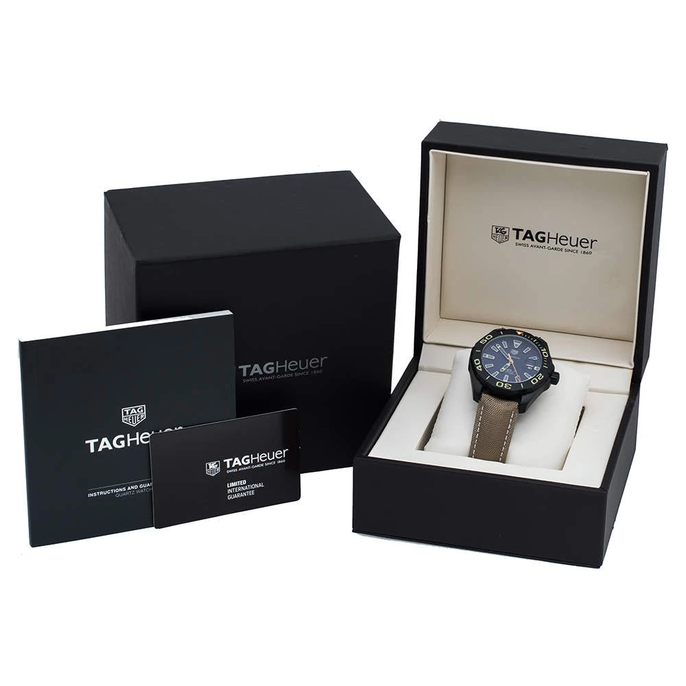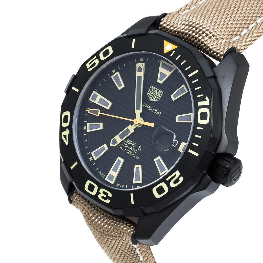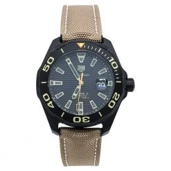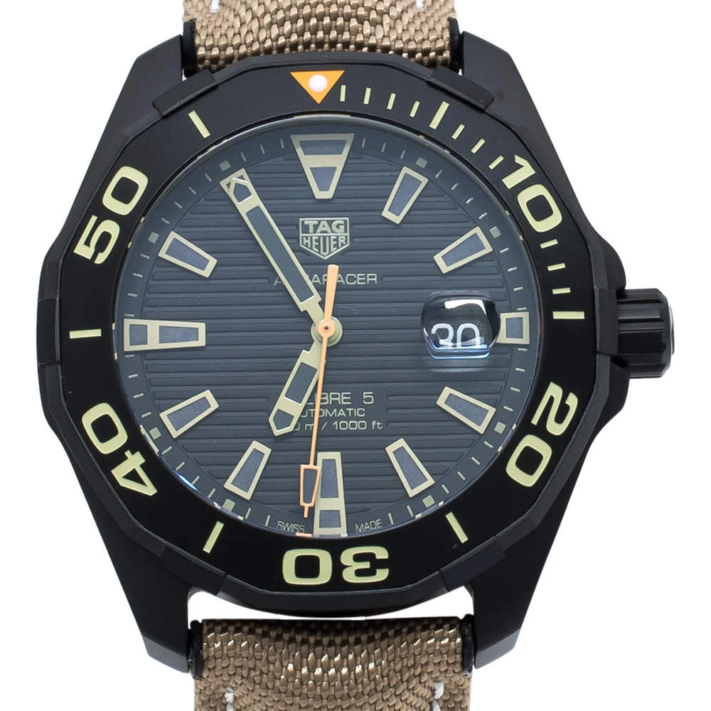 Don luxury on your wrist by owning this exquisite Aquaracer timepiece from TAG Heuer. Swiss-made, the watch has been crafted from black titanium. A scratch-resistant sapphire crystal glass protects a black dial with minute markers around the outer rim, a date window, and index hour markers. It follows an automatic movement and is water-resistant up to 300 meters, making it fit for swimming. Lastly, the watch is equipped with a push-button clasp.