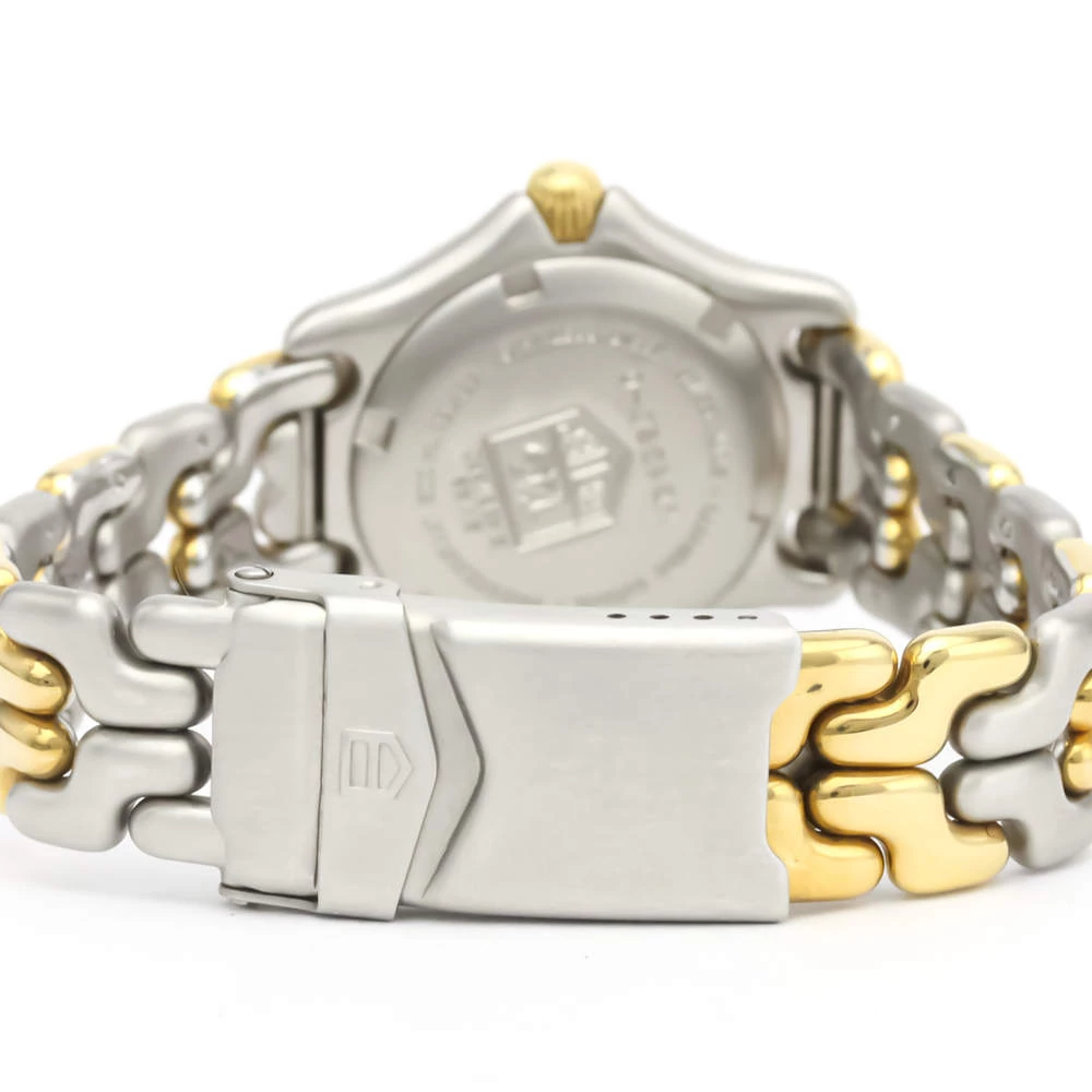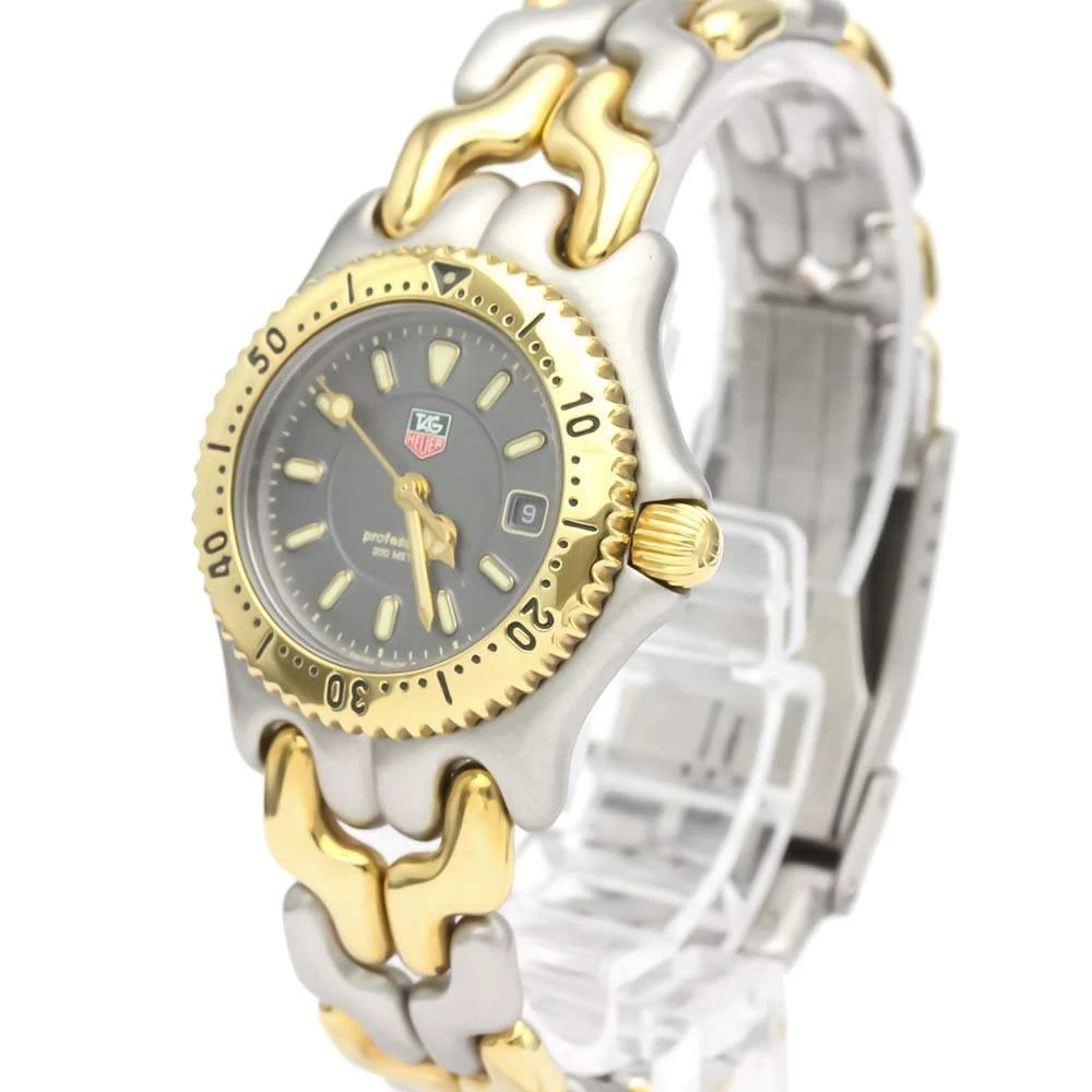 Lead with confidence with this wristwatch from Tag Heuer. The watch has a round stainless steel case and an 18k yellow gold engraved bezel. It encases a grey dial that features raised gold luminous baton indices as hour-markers, a date window, and gold luminous hands. The watch is secured by a steel and gold bracelet.