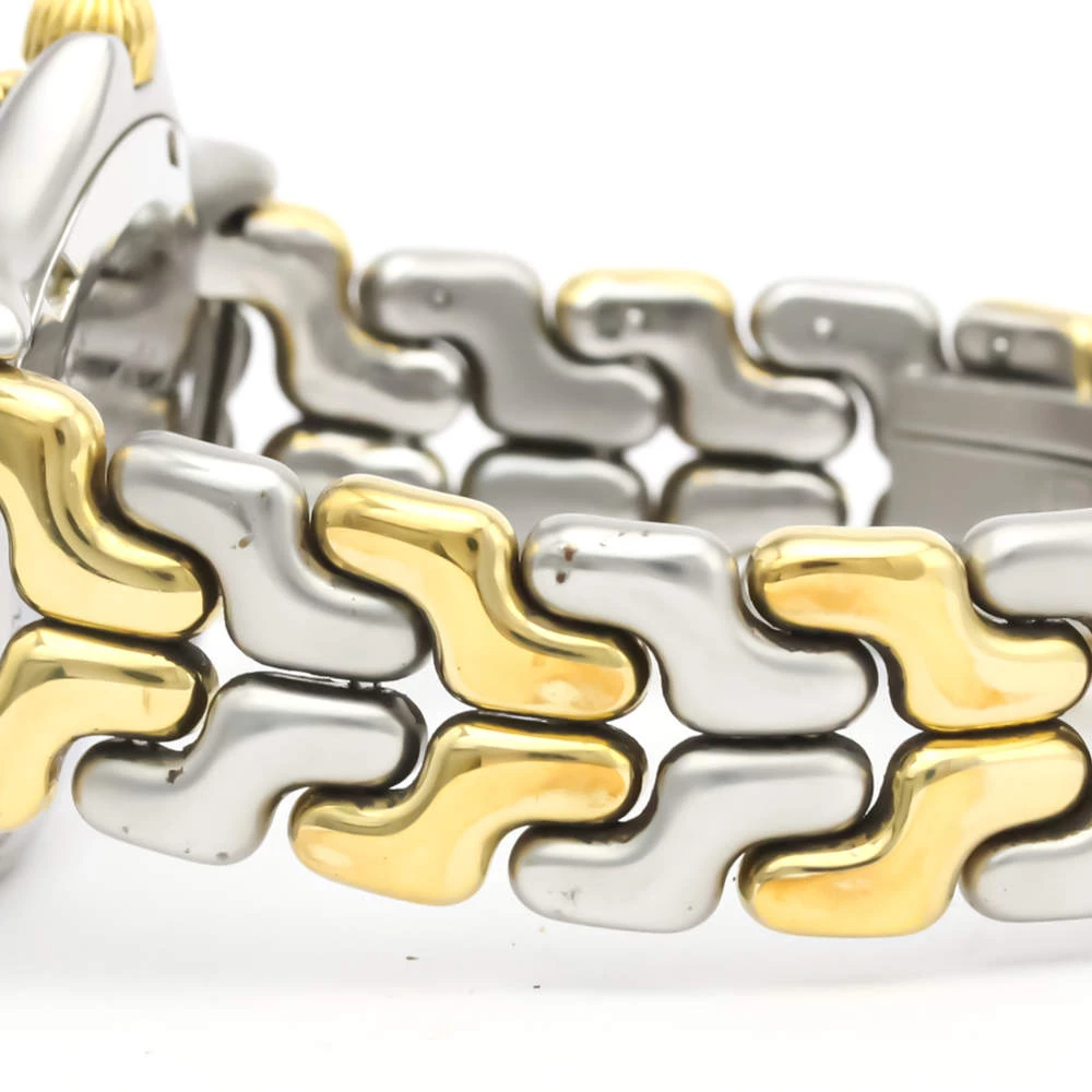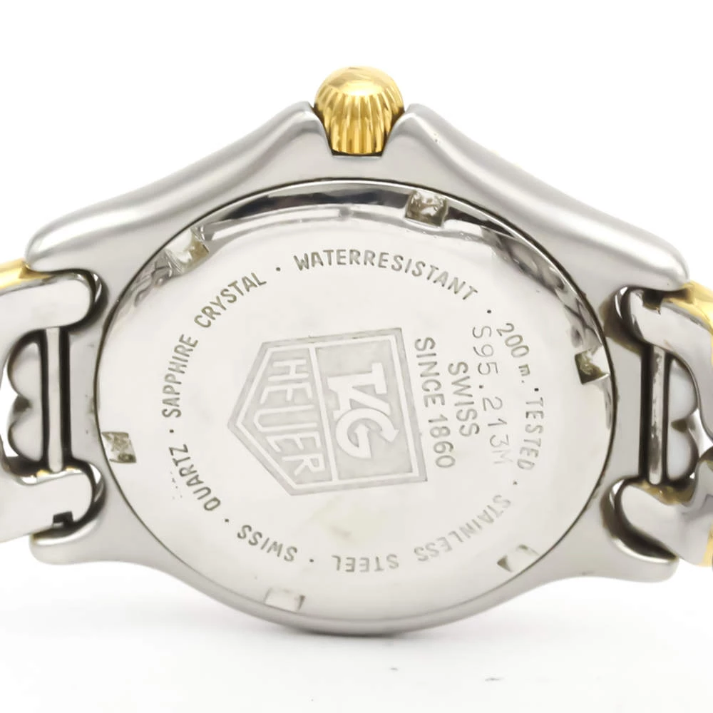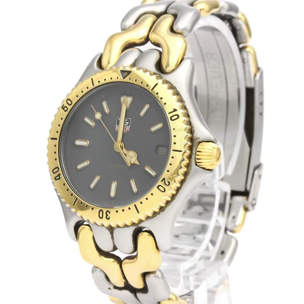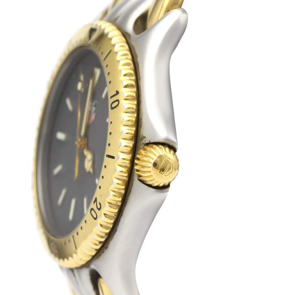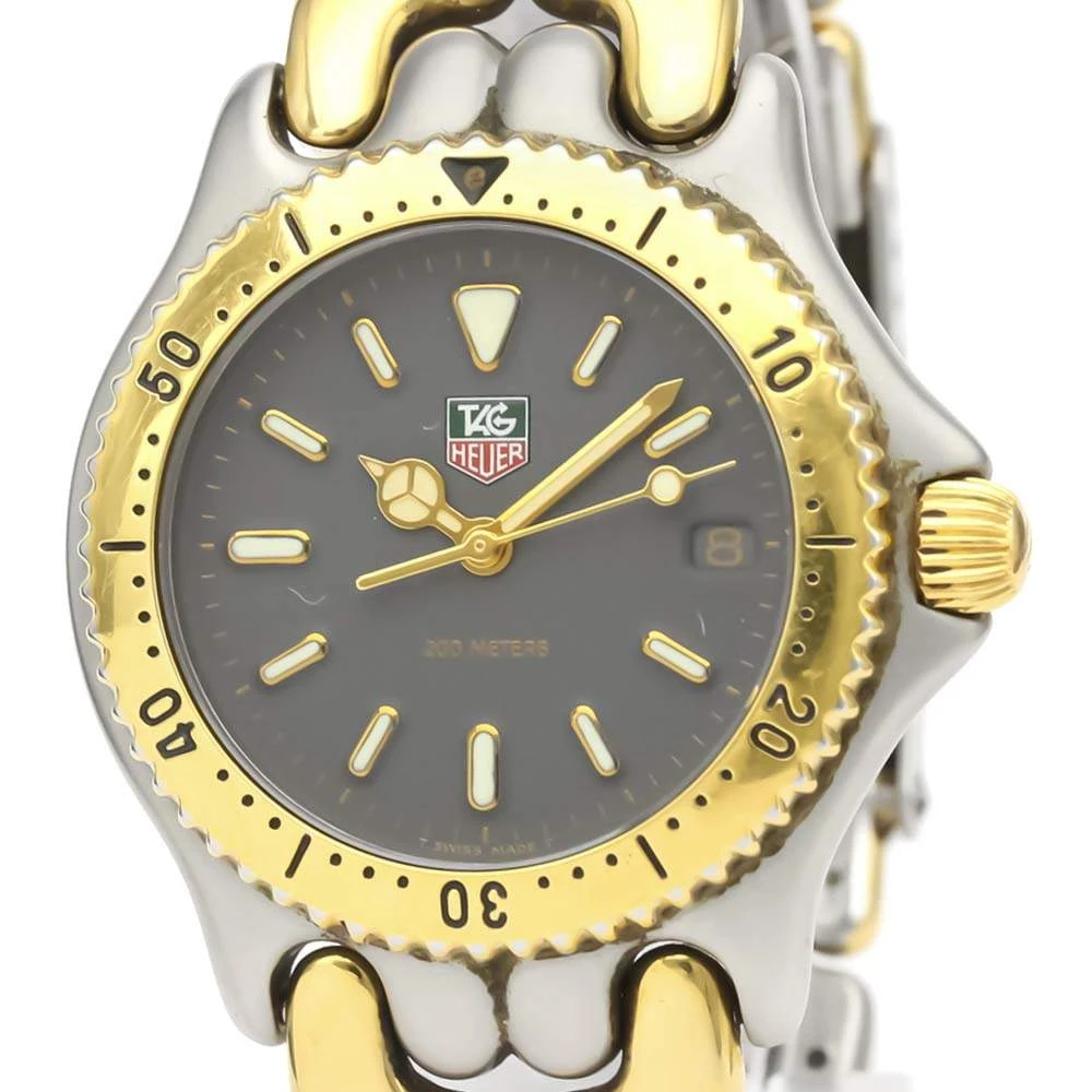Make a difference with this wristwatch from Tag Heuer. The watch has a round stainless-steel case and a yellow gold-plated engraved bezel. It encases a grey dial that features raised gold luminous baton indices as hour-markers, a date window, and gold luminous hands. The watch is secured by a steel and gold bracelet.