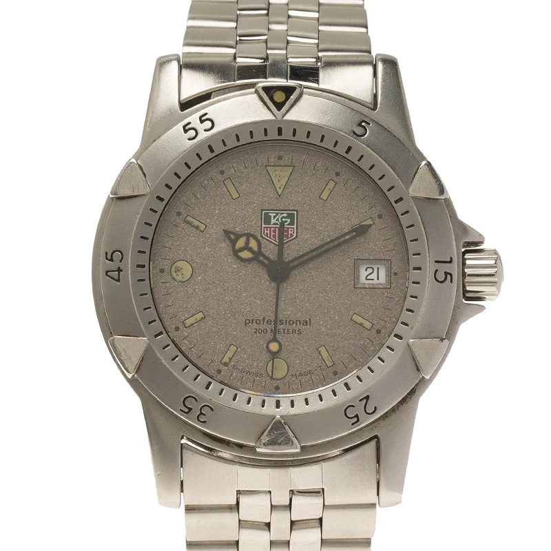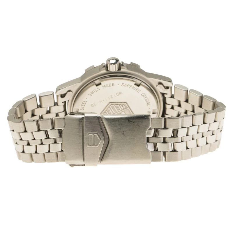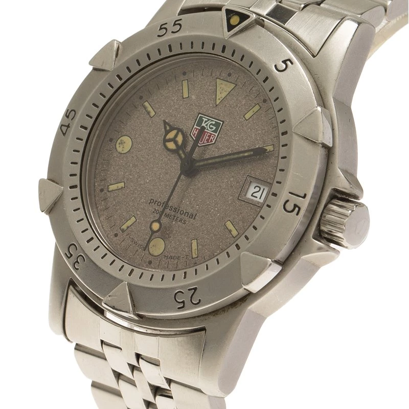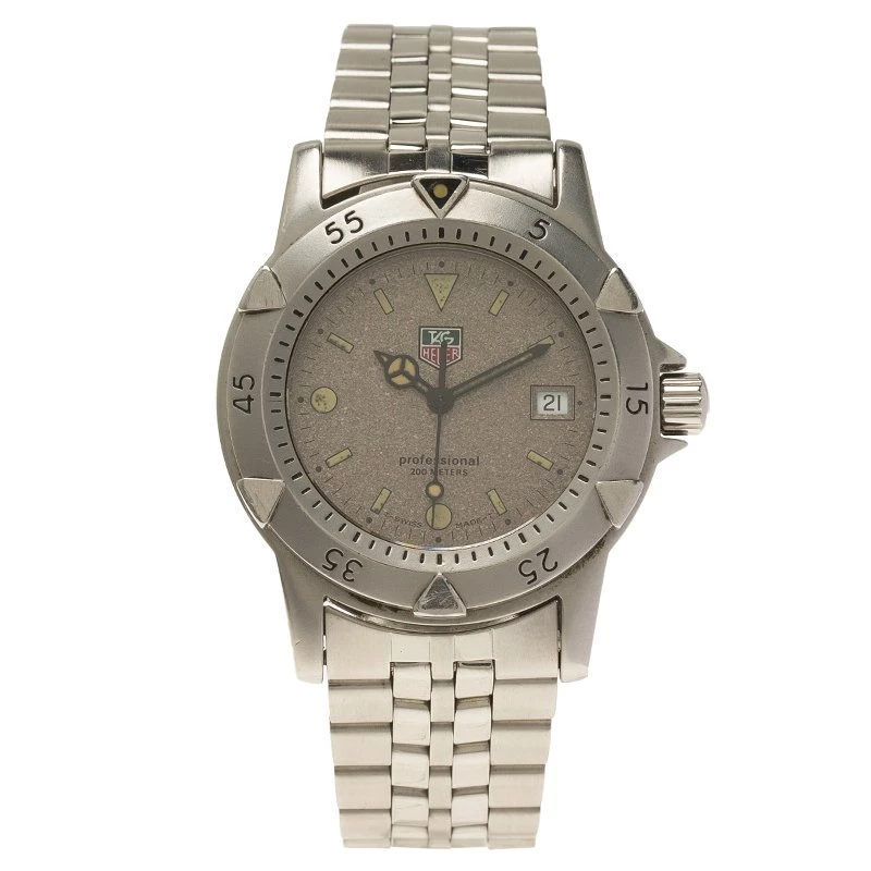 Impress people, by allowing this ravishing and splendid timepiece by Tag Heuer to be the telltale of your stylish and kicky choice. Made with stainless steel, it features a classy bezel engraved with Arabic numerals that counters a stunning grey dial. This watch houses luminescent hands and hour indicators along with a date window at 3 o’clock. The attractive bracelet features a clasp closure, and the 200M water resistance has a quartz movement.