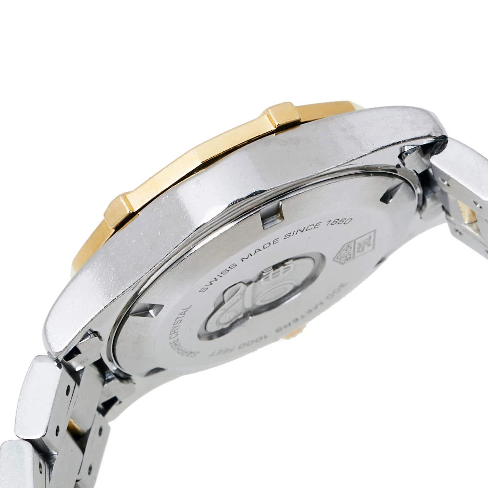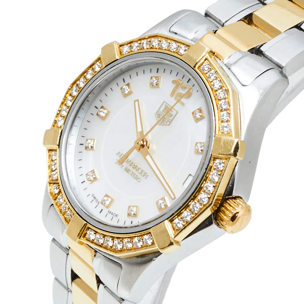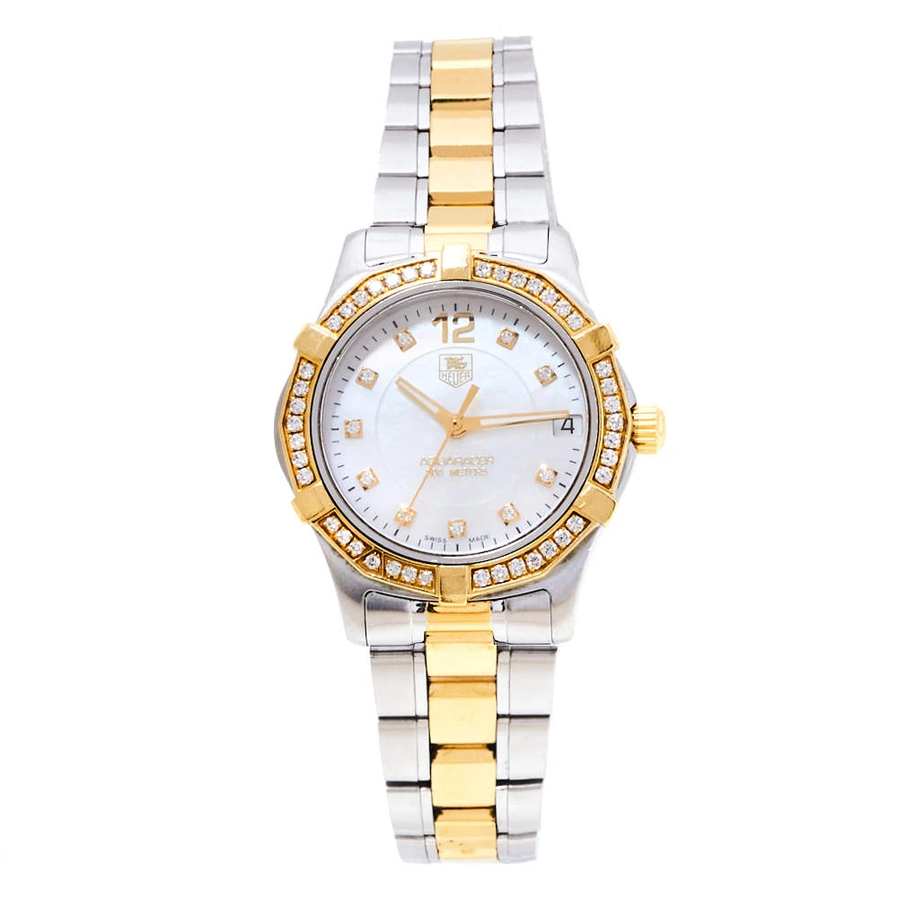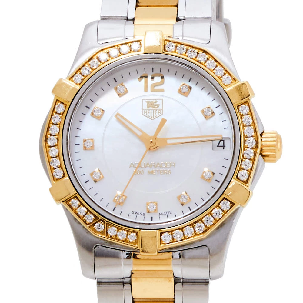 Don luxury on your wrist by owning this exquisite Aquaracer timepiece from Tag Heuer. Swiss-made, the watch has been expertly crafted from two-tone stainless steel. A scratch-resistant sapphire crystal glass protects the white Mother of Pearl dial that exhibits minute markers around the outer rim, a date window at the 3 o’clock position, and diamond hour markers. It follows a quartz movement and is water-resistant up to 300 meters. Lastly, the watch is equipped with a diamond-studded unidirectional rotating bezel and the two-tone stainless steel bracelet fastens with a push-button fold-over clasp. NOTE: (Exotic Material, the item may be restricted from shipping outside the UAE. Please contact us on [email protected] to check if the item can be shipped to your country.)