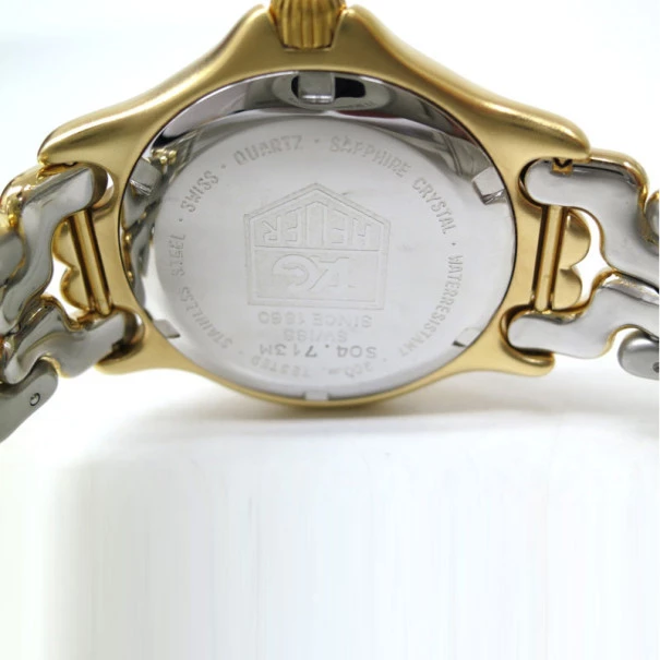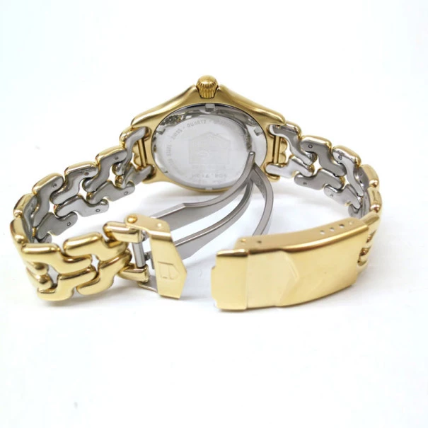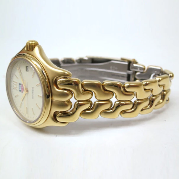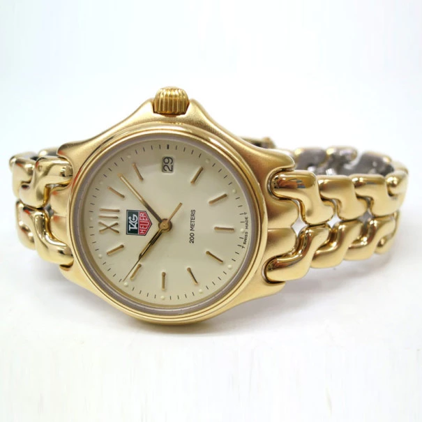 The unisex TAG Heuer Sel series gold plated wristwatch is a truly unique timepiece. Simple yet elegant,the dial looks exquisite in beautiful ivory and features bold hour indicators in gold and minute markers in black. The luminous hands in gold and ivory are pleasing to the eye. This gold plated, made in Switzerland wristwach has a date window at 3 o’clock. The smooth and enhanced bezel in gold defines this impeccable creation. This watch is the perfect buy for formal and semi-formal occasions.Gender: UnisexOriginal Retail Price: USD $550Condition: Gently Used (The watch is in good working condition and does not require any service. It was polished and sanitized in February 2013)Case size: 34mmBand material: Gold platedBand Size: 17cm wristMovement: QuartzCase material: Gold platedBezel: Gold platedBody Weight: 84gIncludes: The Luxury Closet Watch Box