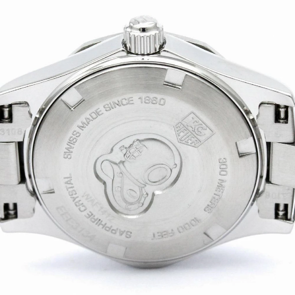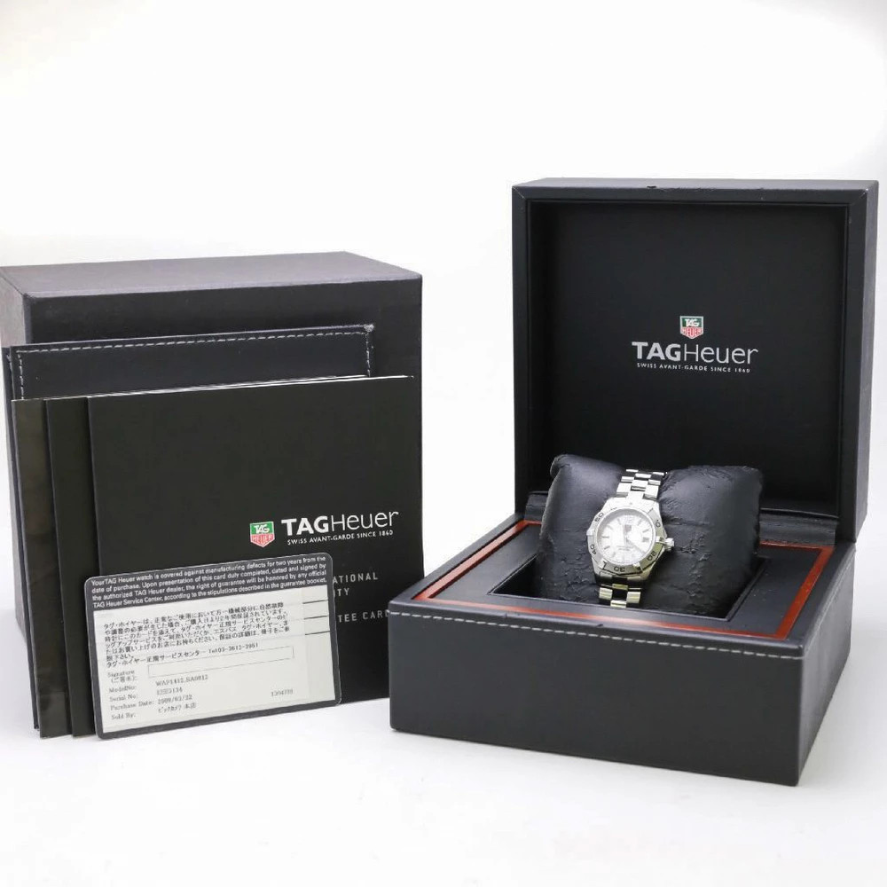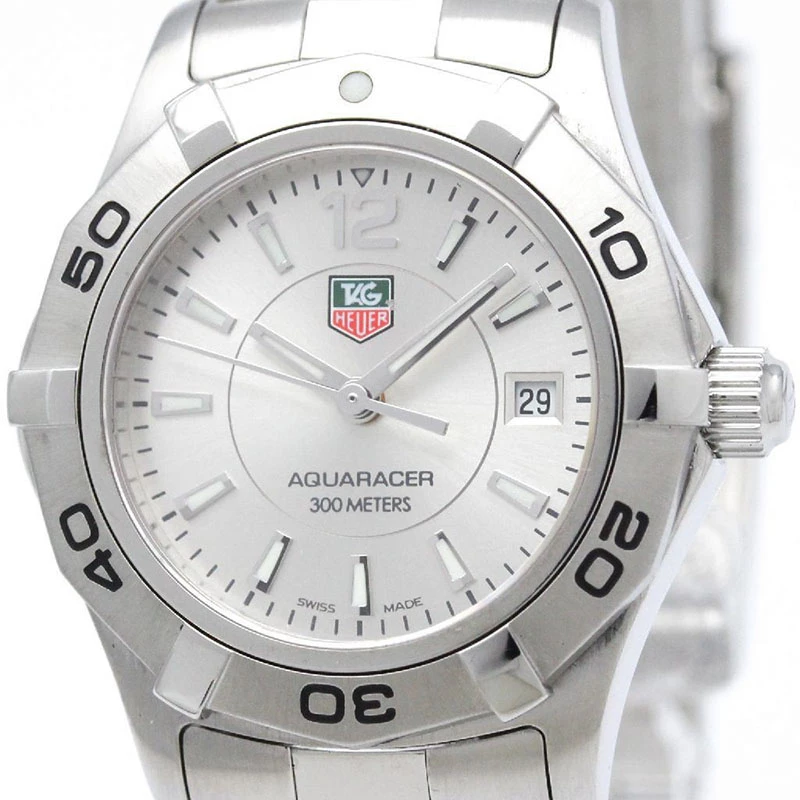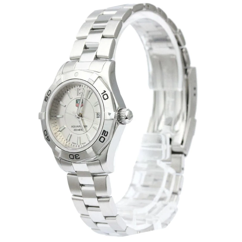 “Inspired by the aquatic world, this Tag Heuer Aquaracer Women’s watch features a silver stainless steel body and a case diameter of 27mm. It comes with a silver dial with hand-applied faceted indexes with luminescent markers, faceted hour and minutes hands with luminescent markers and a date window at 3 o’clock. It comes with a water resistance up to 300m and a unidirectional turning bezel with faceted ceramics. It features a bracelet strap and secured with a clasp closure”.
