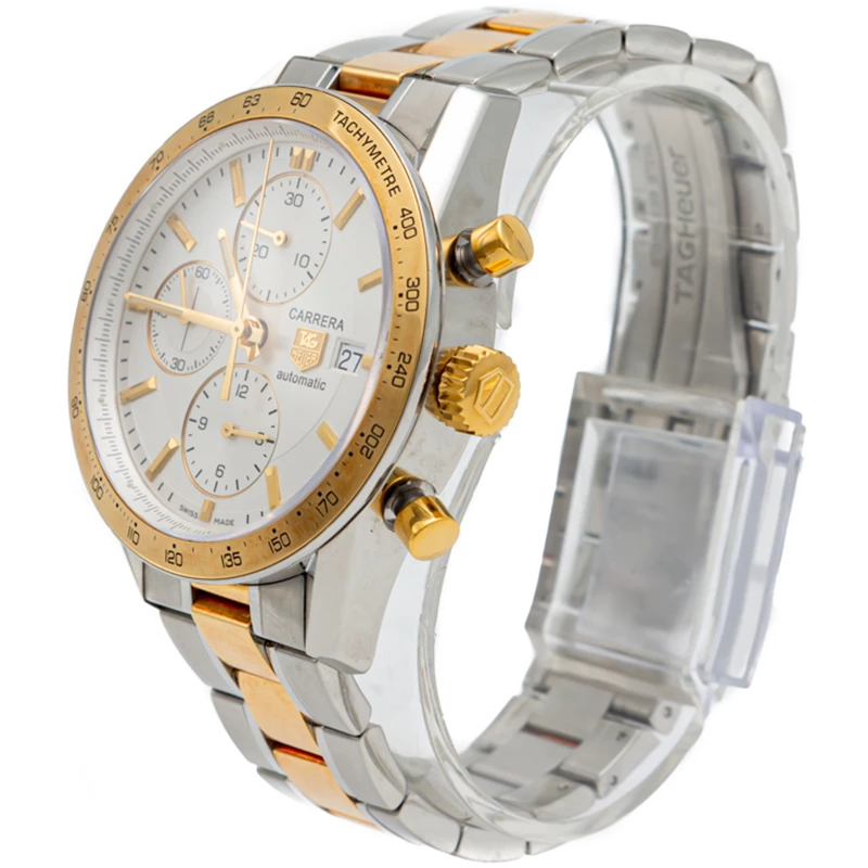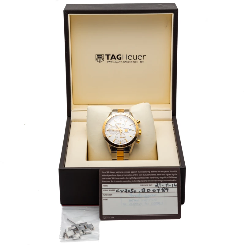 Look good with this Tag Heuer wrist watch for men. The watch has a round stainless steel case with an 18k yellow gold bezel. It encases a white dial which features three sub dials, yellow gold baton indices as hour-markers, a date window, and gold luminous hands. The watch is secured by a stainless steel and gold bracelet.