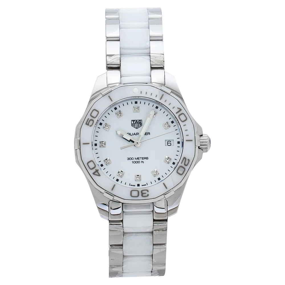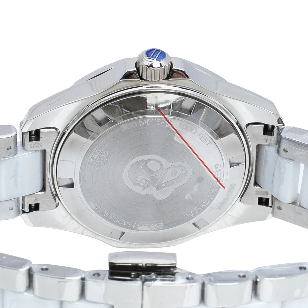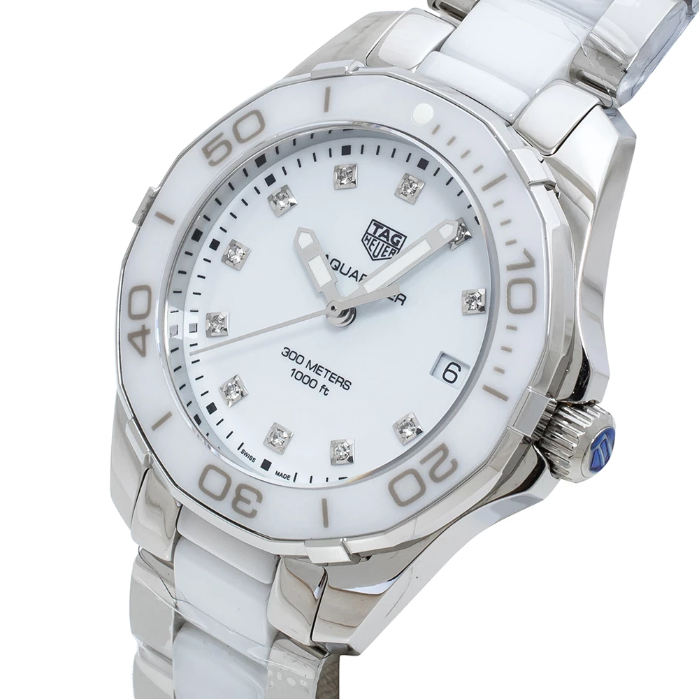 Don luxury on your wrist by owning this exquisite Aquaracer timepiece from TAG Heuer. Swiss-made, the watch has been crafted from stainless steel and white ceramic. A scratch-resistant sapphire crystal glass protects a white dial with minute markers around the outer rim, a date window, and stud hour markers. It follows a quartz movement and is water-resistant up to 300 meters, making it fit for swimming. Lastly, the watch is equipped with a push-button clasp.