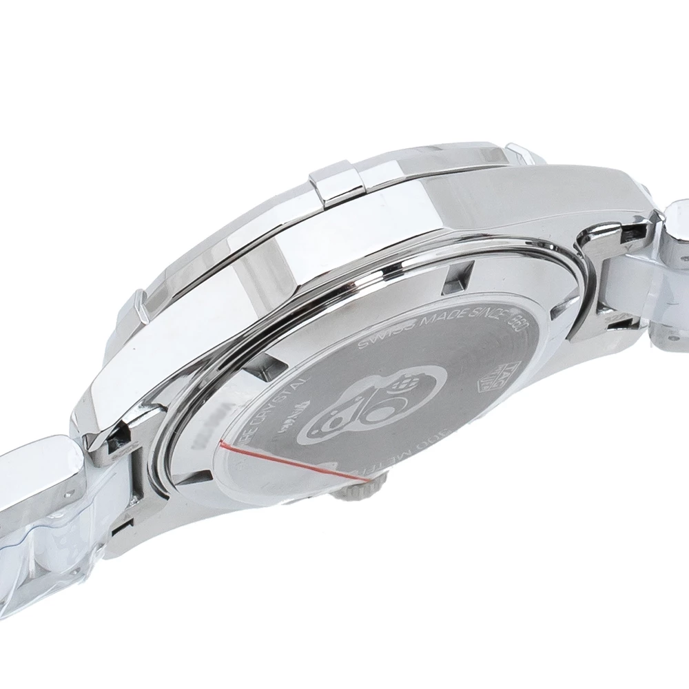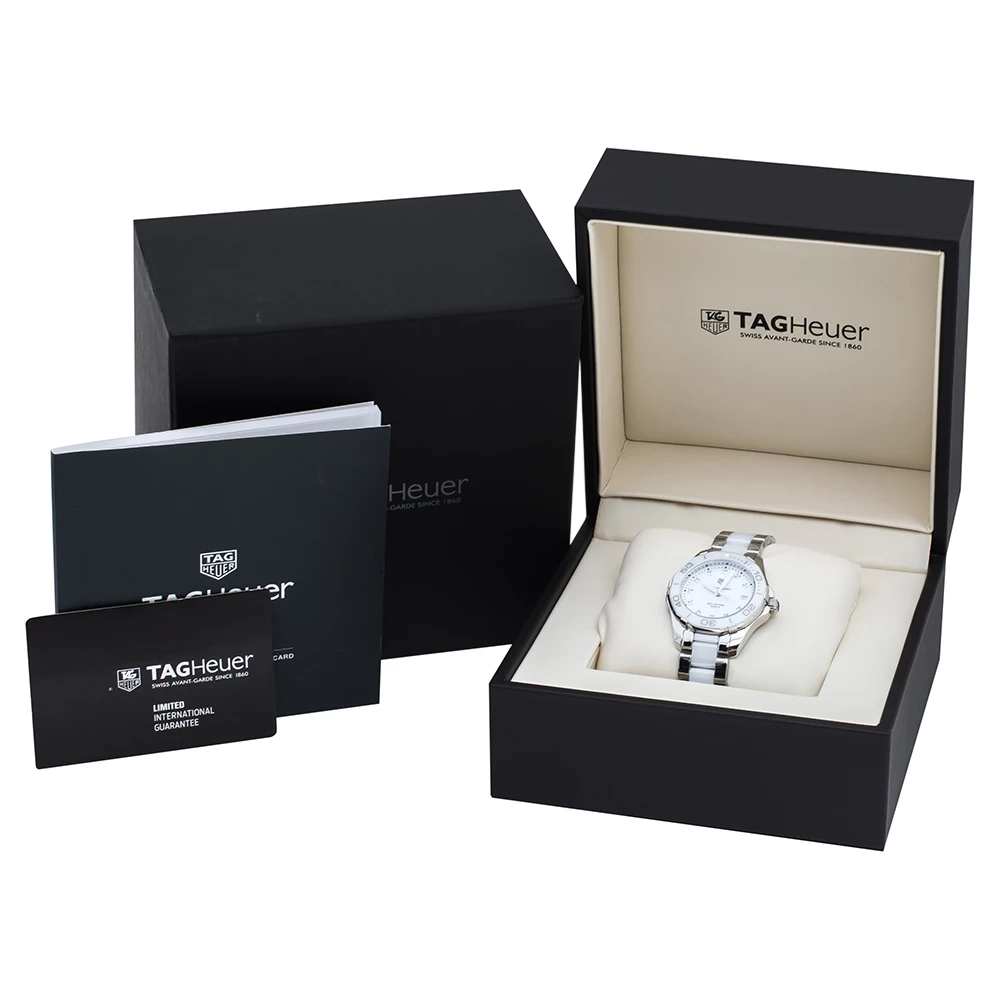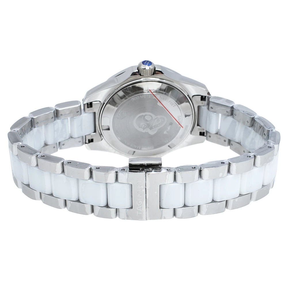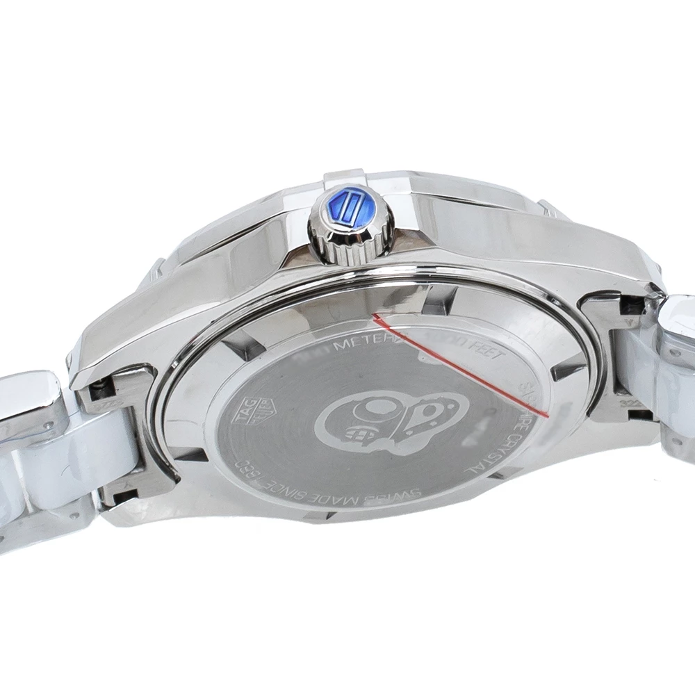 Don luxury on your wrist by owning this exquisite Aquaracer timepiece from TAG Heuer. Swiss-made, the watch has been crafted from stainless steel and white ceramic. A scratch-resistant sapphire crystal glass protects a white dial with minute markers around the outer rim, a date window, and stud hour markers. It follows a quartz movement and is water-resistant up to 300 meters, making it fit for swimming. Lastly, the watch is equipped with a push-button clasp.